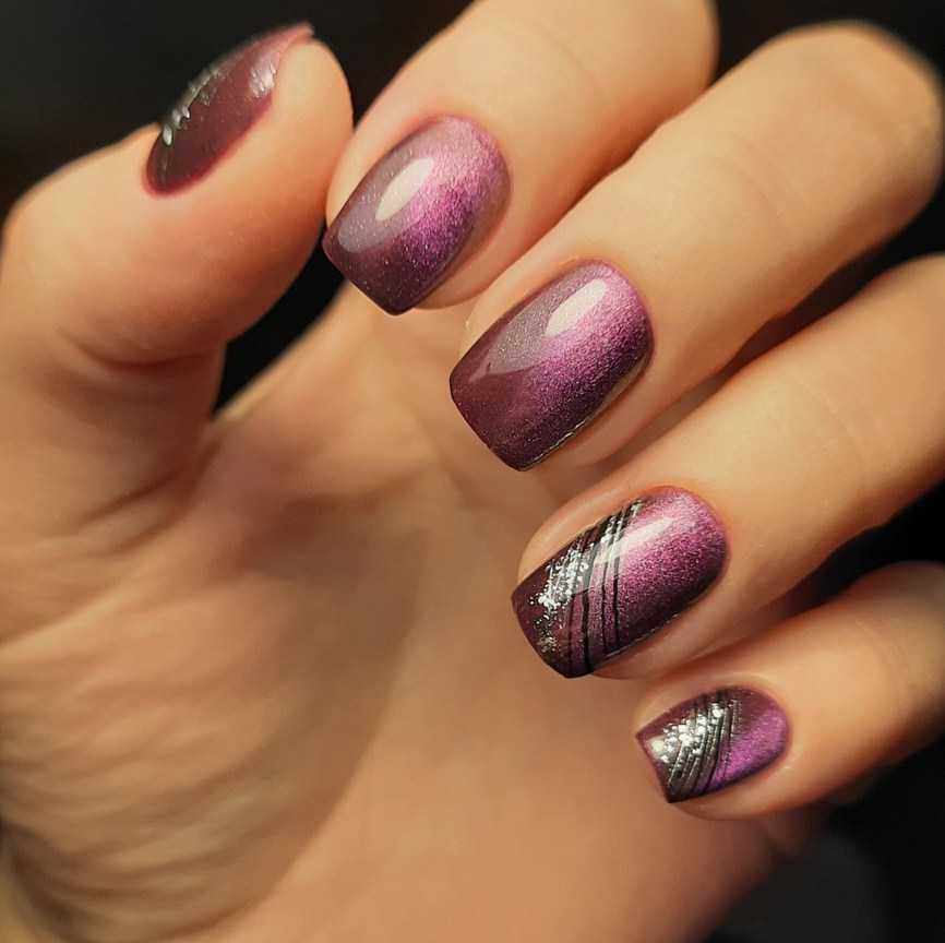 Например, нанесите поверх камуфлирующей нюдовой или розовой базы серебристую «кошку». Дополнительно усовершенствовать маникюр можно акцентными полосками, блёстками, фольгой поталь или другой «кошкой», например, 9д.
