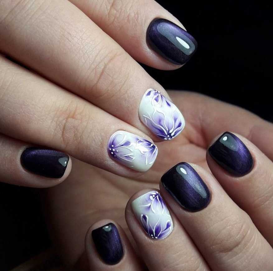 С художественной росписью. Маникюр кошачий глаз, выдержанный в светлых тонах, также будет гармонировать и с рисунками. Наиболее популярным вариантом на сегодня являются флористические художества, выполненные в технике тонких линий. Раскрас таких рисунков должен быть обязательно темным. Уместными будут и разноцветные художества, которые должны быть расположены на одном пальце.