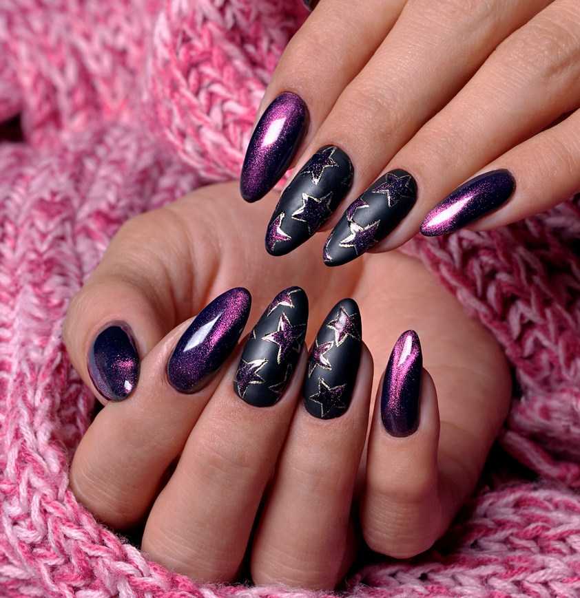 Матовый. Фактурное бархатное покрытие принято использовать нынче во всех дизайнах. И кошачий глаз не стал тому исключением. В данном маникюре матовым финишем можно покрыть несколько пальцев или даже всю руку.