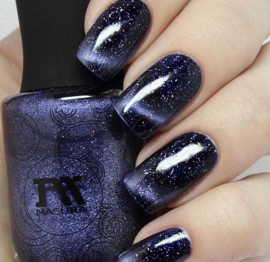 Что касается варианта наиболее востребованного среди поклонниц модных течений, зачастую ими отдается предпочтение технике «кошачьего глаза», выполненной с применением для стемпинга именно черноватого оттенка. Для основы же подбираются любой вид лака с характерным мерцанием.