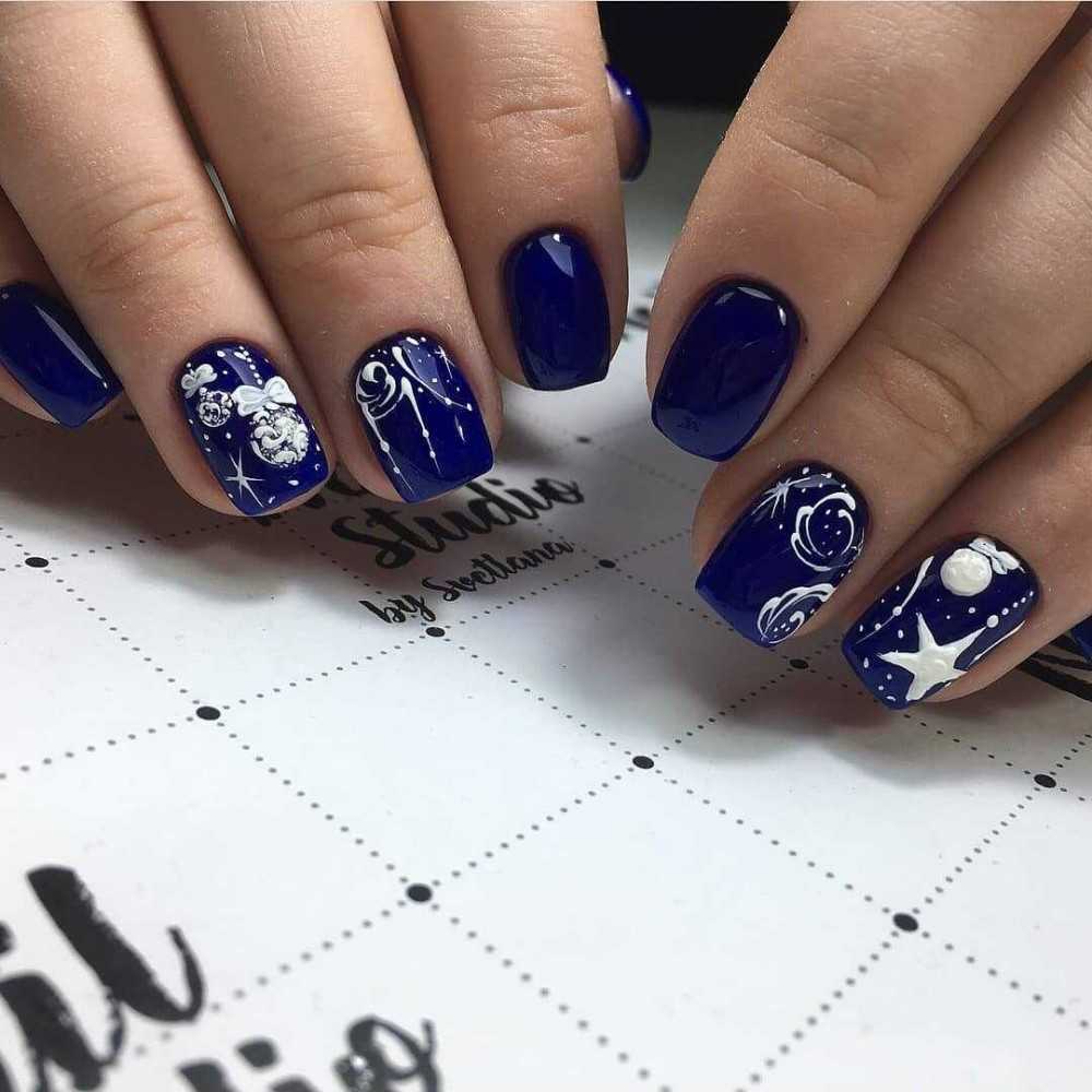 Отдельно выделим густой синий. Такой лак обязательно должен быть в арсенале модницы этой зимой. И для новогоднего маникюра можно выбрать синий цвет в качестве основного. На синем фоне эффектно смотрятся новогодние блестящие шарики, конфеты, елочные лапы и другие атрибуты праздника.