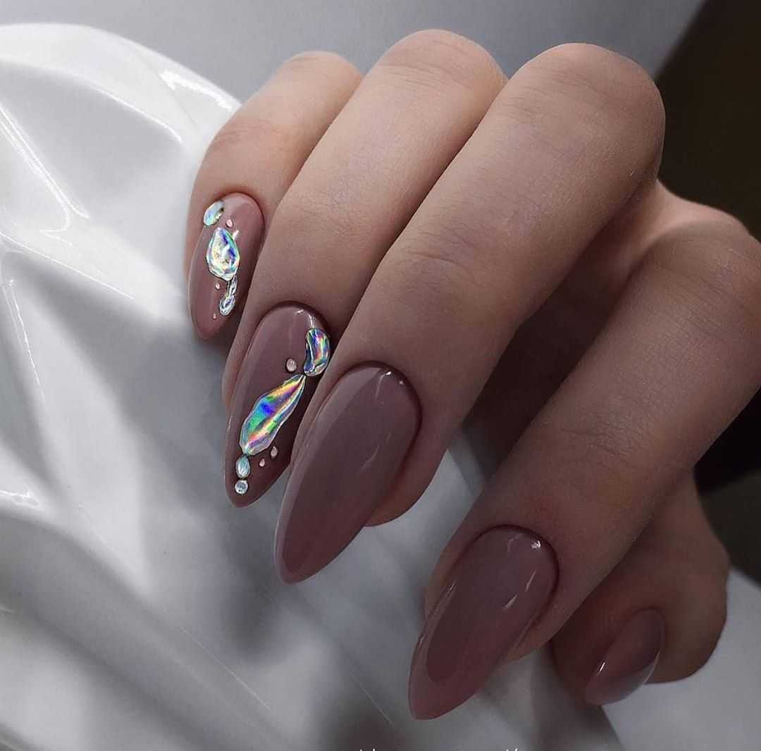 Если глянца категорически не хочется, то матовый топ можно разбавить несколькими блестками или стразами. Они сделают маникюр более необычным и эксклюзивным.