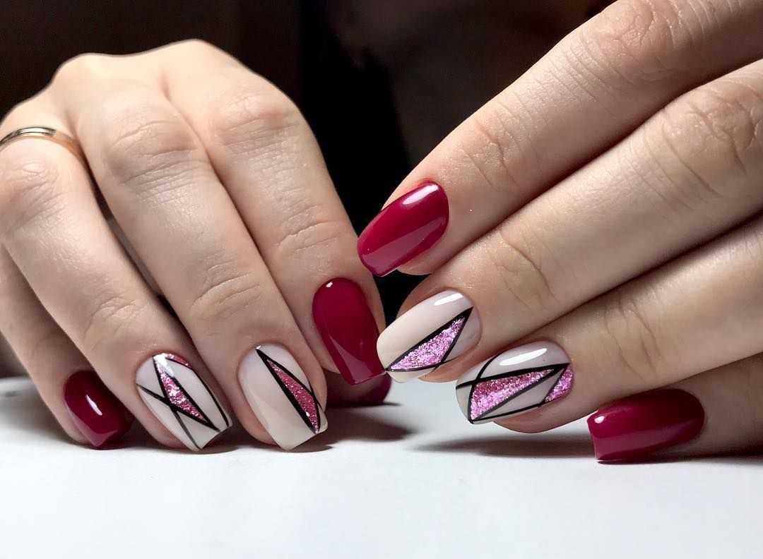 Помимо традиционного оформления, для новогодней ночи также подходит и геометрический дизайн. В зависимости от выбранных деталей, их сочетания между собой в целом зависит восприятие маникюра. Для празднования 2021 года рекомендуем выбрать более смелое, заметное оформление. Дополните маникюр декором, и он точно будет идеальным решением для любого образа.