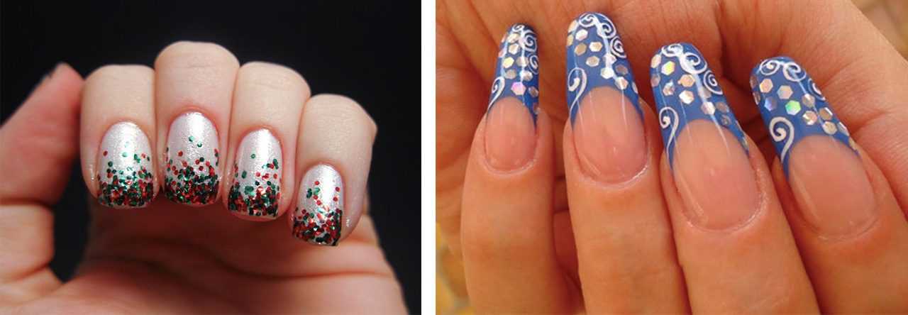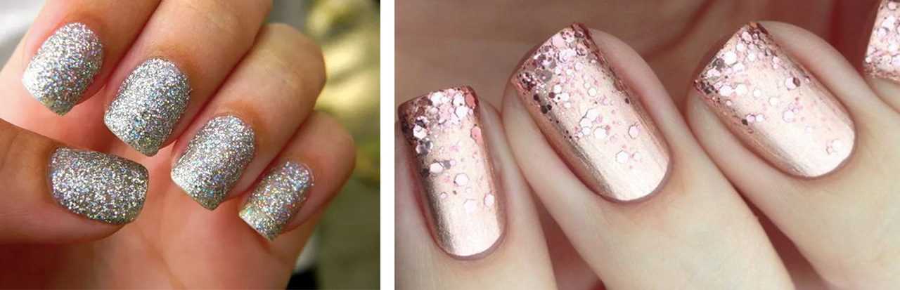 Декор с легкостью используется в классическом дизайне — блестящий френч и градиент(омбре, растяжка) блестками — тот самый идеальный вариант, который подойдет и к повседневному маникюру и к вечернему.