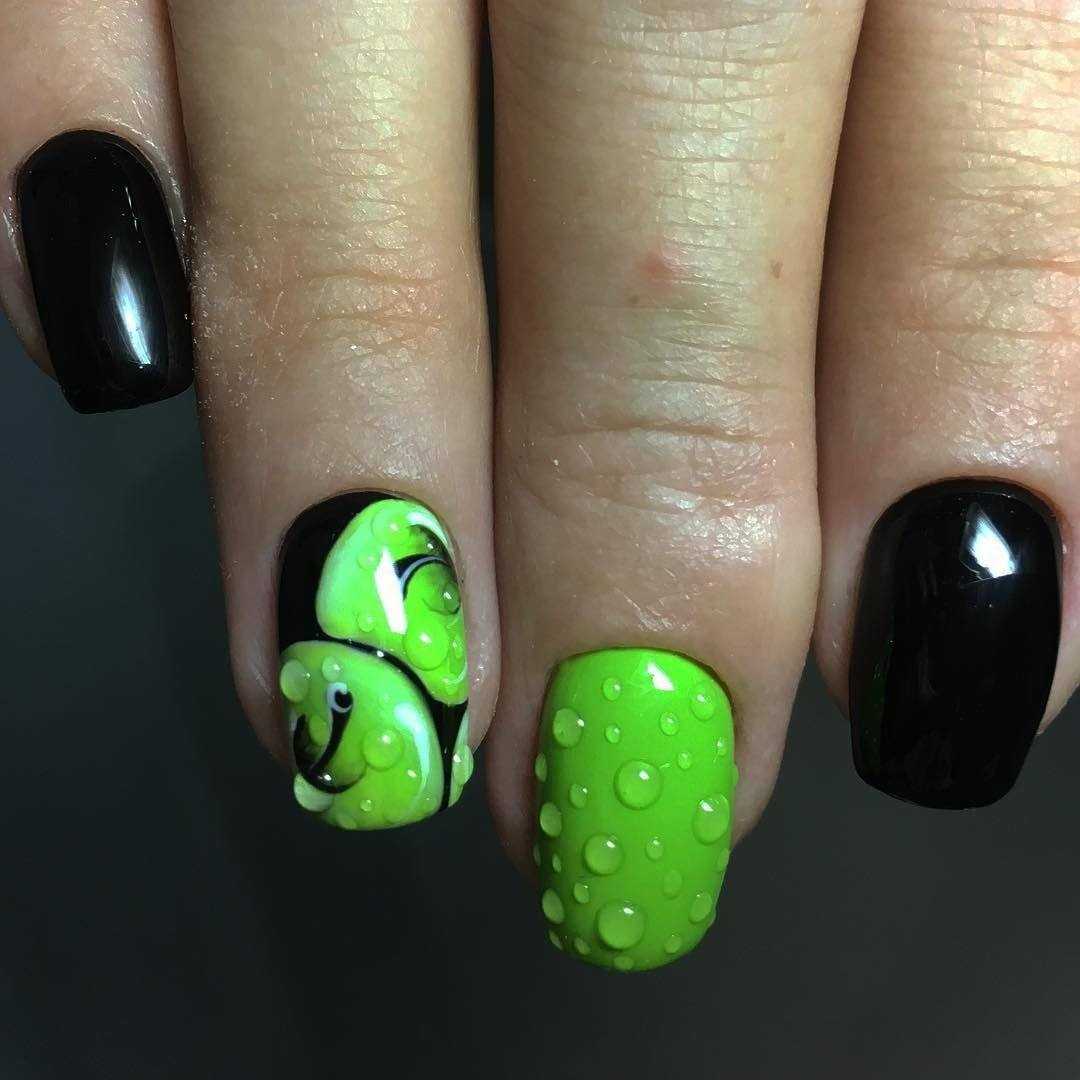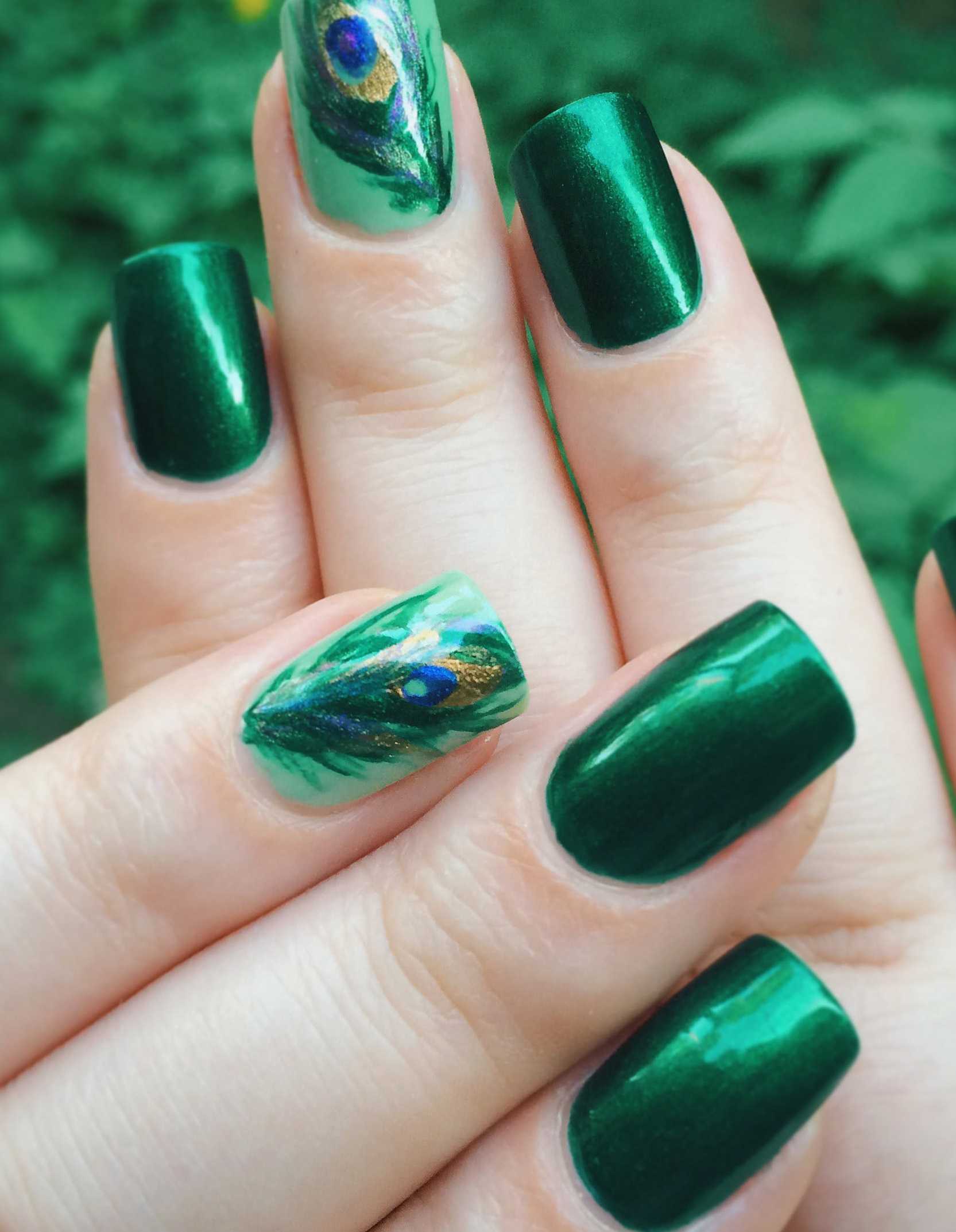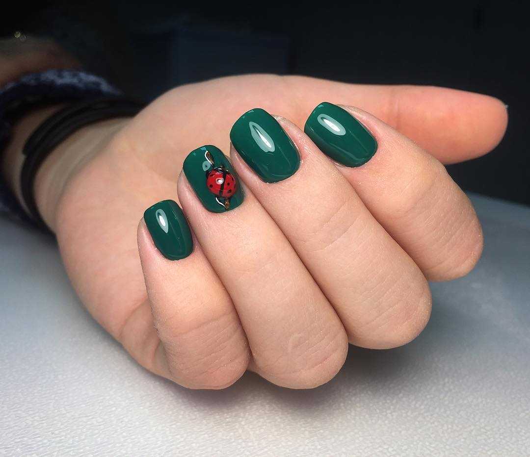 Насыщенность и фактурность нейл-арта определяется количеством дополнительного цвета в зеленом дизайне и присутствием других элементов.