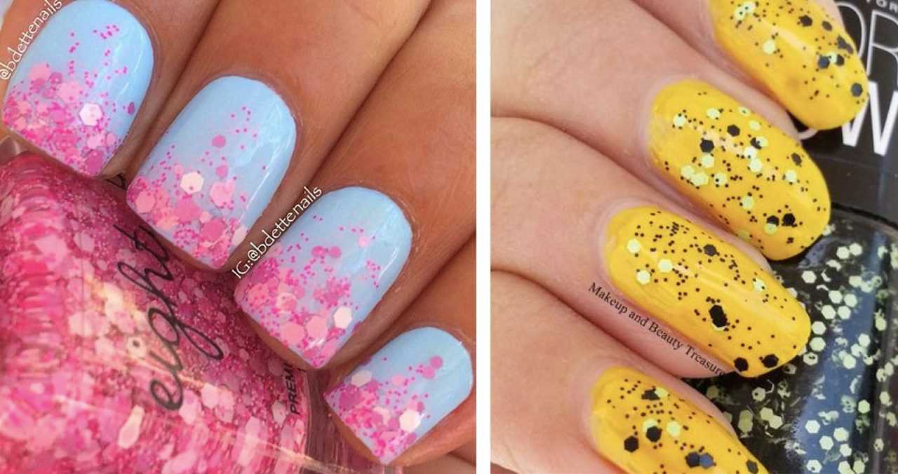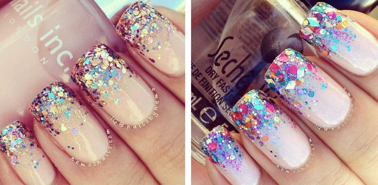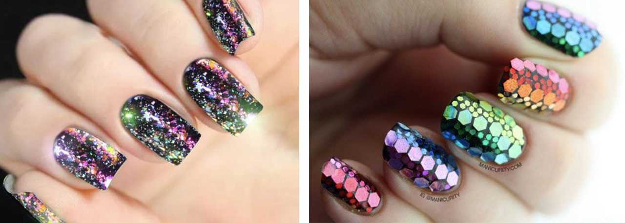 Начиная от мельчайших блесток-пылинок и заканчивая пайетками или конфетти (крупными кругляшами, ромбами, звездочками, сердечками), которые составляются в различные формы.