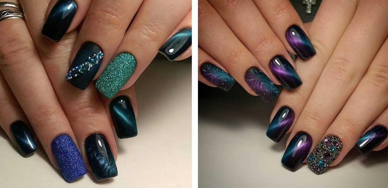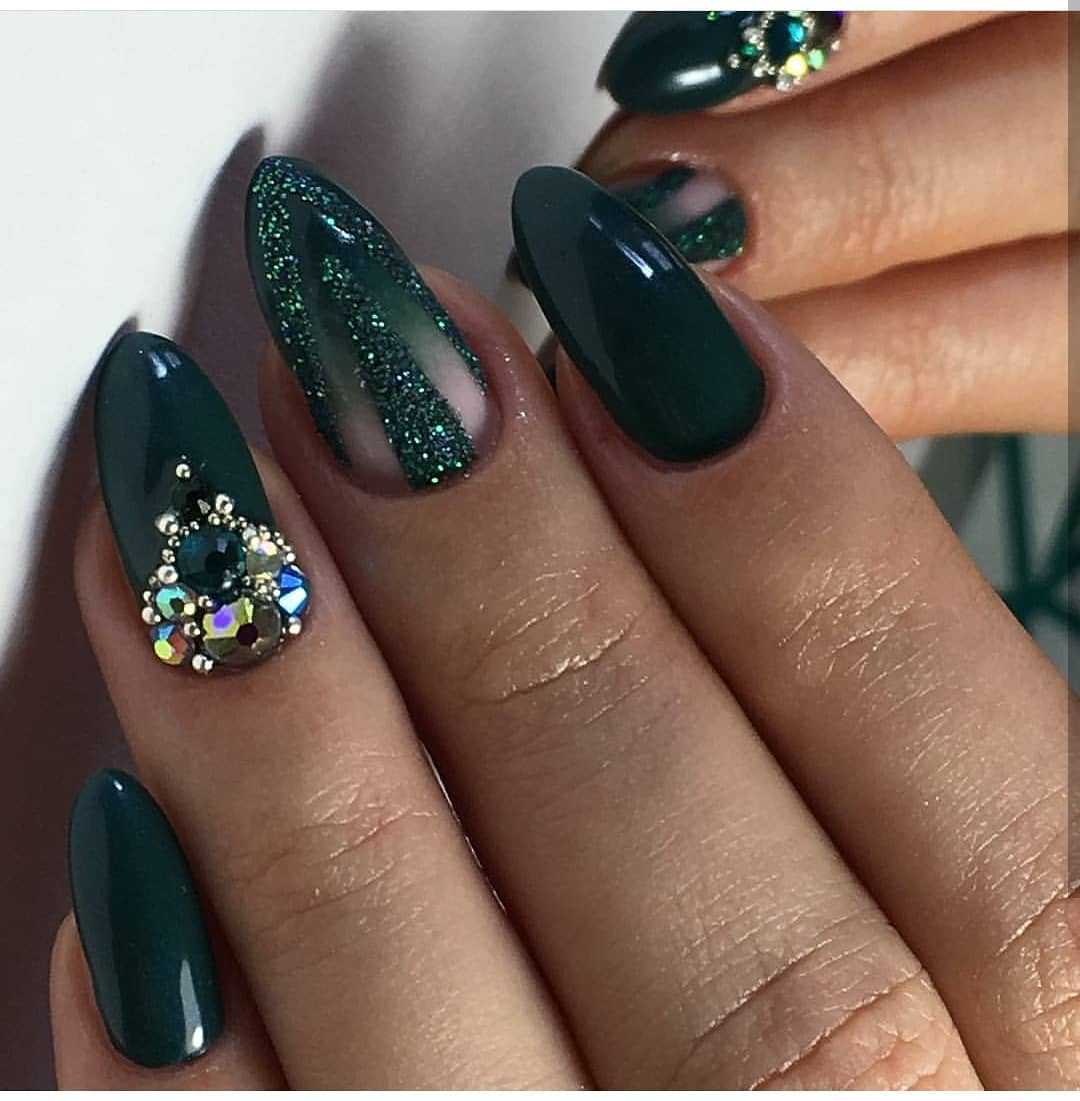 Выгодная комбинация – изумрудный и черный. С помощью данных оттенков можно создать модный и изящный маникюр. Помимо основных цветов, возможно украшение гламурными стразами, блестками золотистого оттенка.