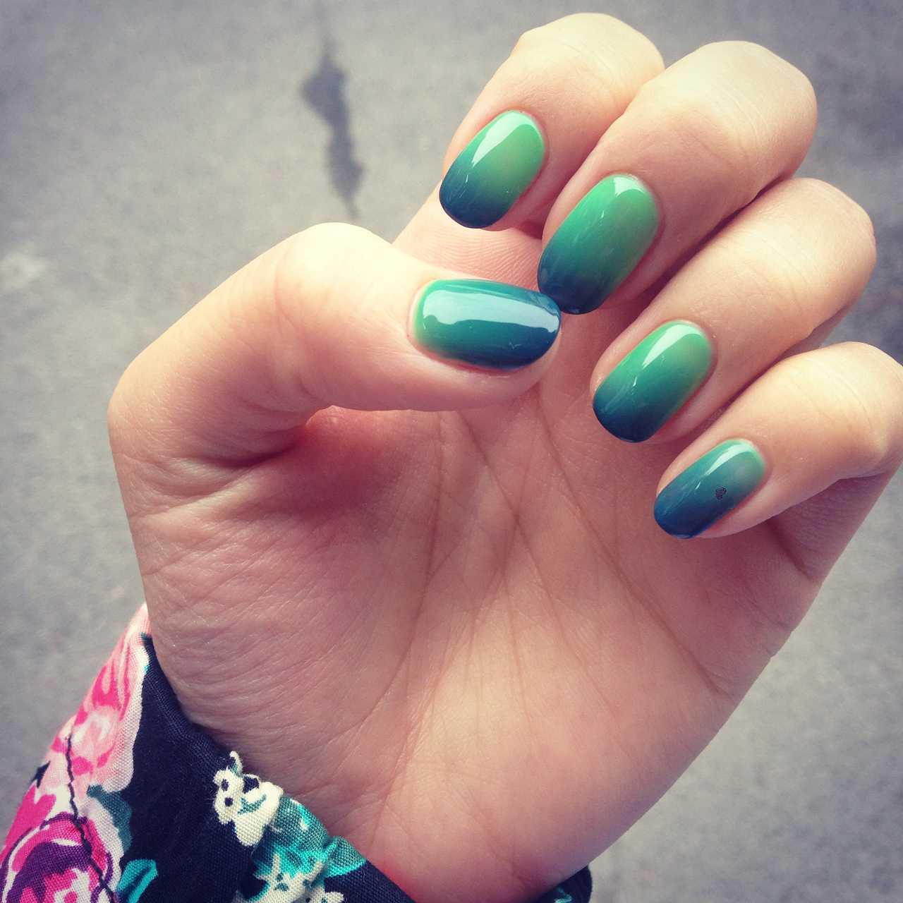 Омбре или градиент приобретает все большую популярность среди любительниц изысканного маникюра. Вслед за модными тенденциями окрашивания с переходами в разные оттенки и цвета в парикмахерском искусстве такое направление появилось и в маникюре. Действительно оригинальная и интересная идея, особенно в случае сочетаний разных оттенков и цветов с зеленым лаком. Заманчивая и всепоглощающая цветовая игра: переходы контрастных цветов к зеленому, плавные переходы близких по цвету оттенков зеленого. Наиболее удачно градиент выглядит на длинных ногтях или на коротких, но длинных по форме.