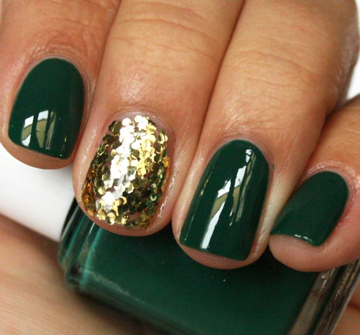 Это — один из самых популярных способов использования зеленого лака. Переливы от глубокого зеленого оттенка до светлых бликов выглядят очень эффектно и очень уместны на празднике.