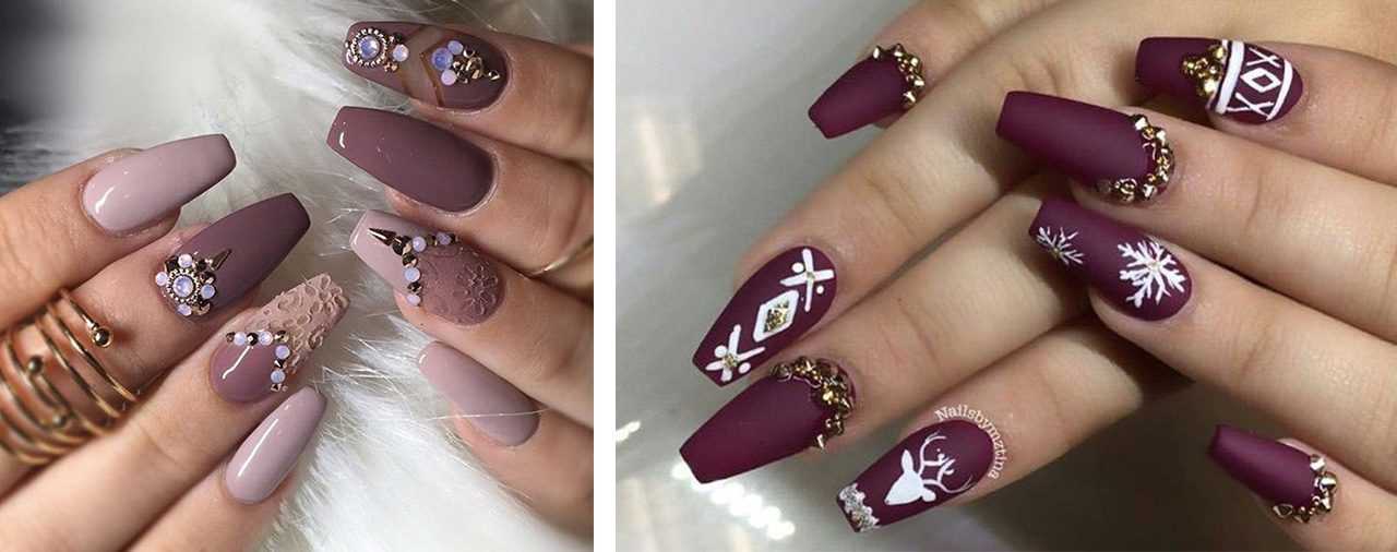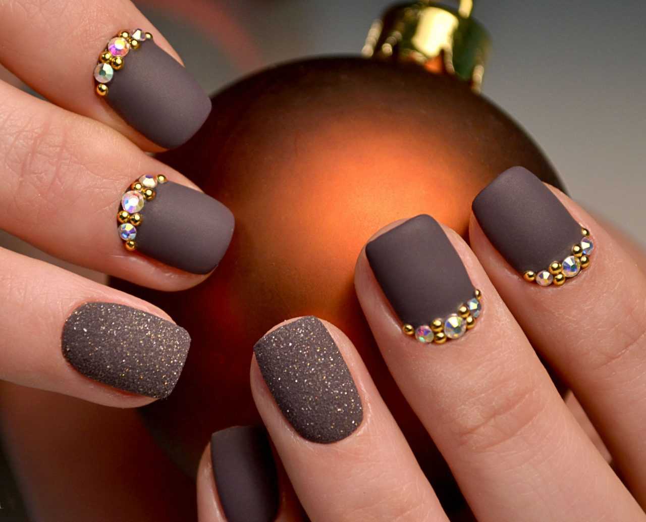 Блестящие элементы декора, такие, как стразы, с матовым лаком лучше не использовать: они убивают само впечатление от этого спокойного, выдержанного по стилю маникюра.