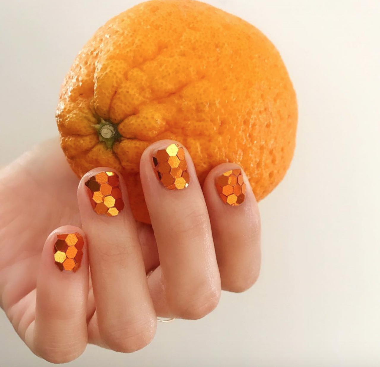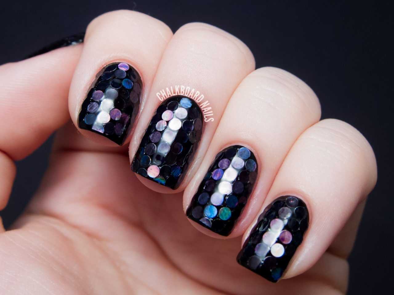 Данный вариант — самый стильный и интересный в 2023-2024. Достаточно экстравагантно и оригинально смотрятся круглые блестки и всевозможные геометрические формы. Наиболее популярные и запоминающиеся — золотые ромбики, с помощью которых есть возможность полностью покрыть ногтевую пластину.