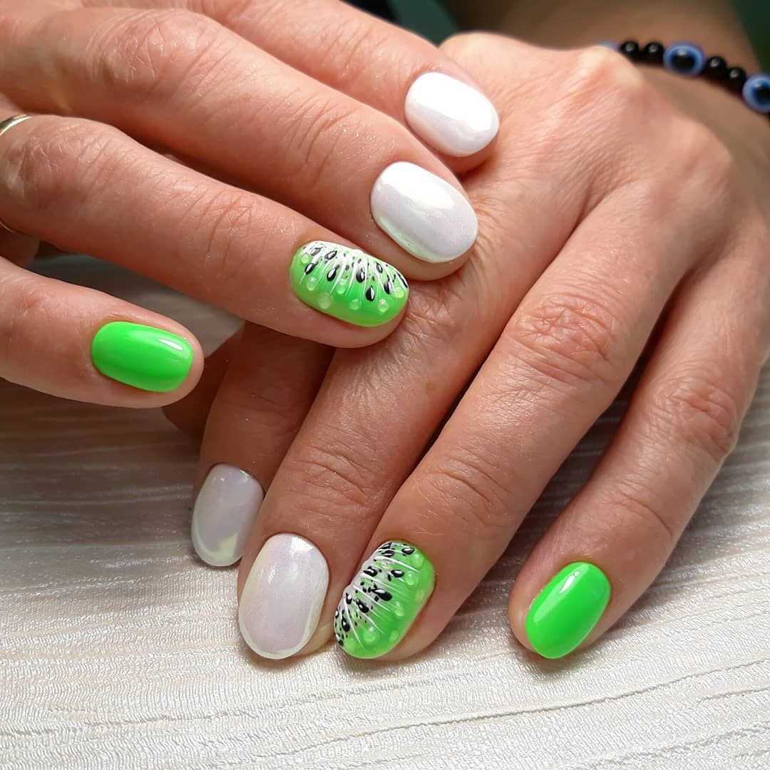 Желто-зеленая комбинация – это априори яркий и насыщенный маникюр короткие ногти. Это свежее сочетание больше всего подходит для лета и ассоциируется с фруктами: лимоном, сочным яблоком, киви. Именно поэтому сюда отлично впишутся фруктовые узоры или наклейки. Очень красиво смотрится желто-зеленый градиент – горизонтальная растяжка от ярко-лимонного к салатовому.