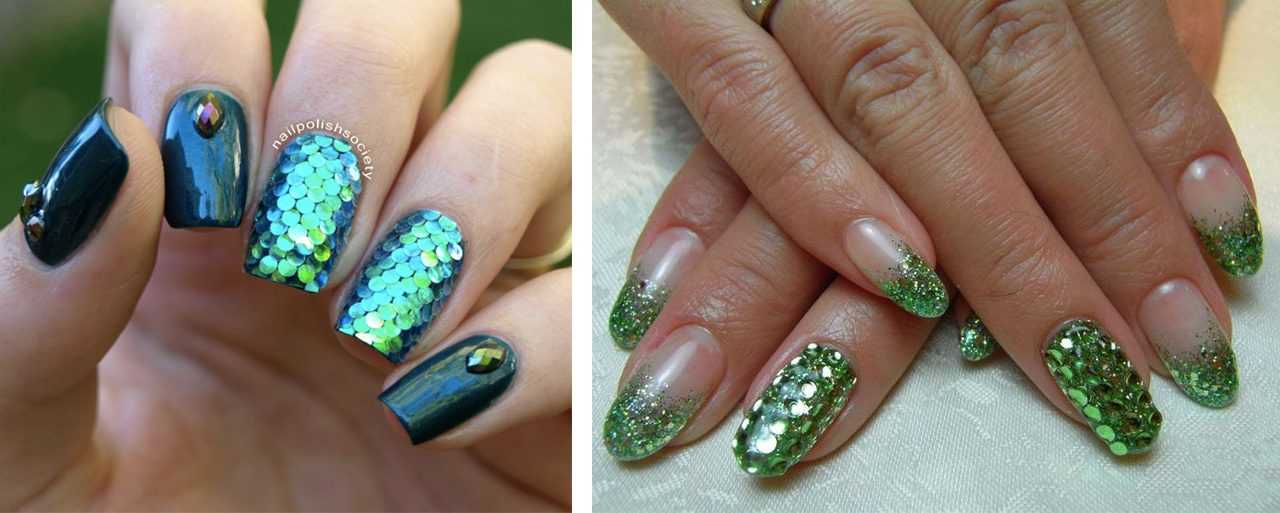 Актуальное течение в одежде и косметике – глиттер. Этот тренд предусматривает множество блестящих элементов, притягивающих взгляд своим мерцанием. Зеленое покрытие можно дополнить блестящими украшениями любых цветов. Либо наоборот, основу любой цветовой гаммы, разнообразить блестящими элементами цвета «изумруд».