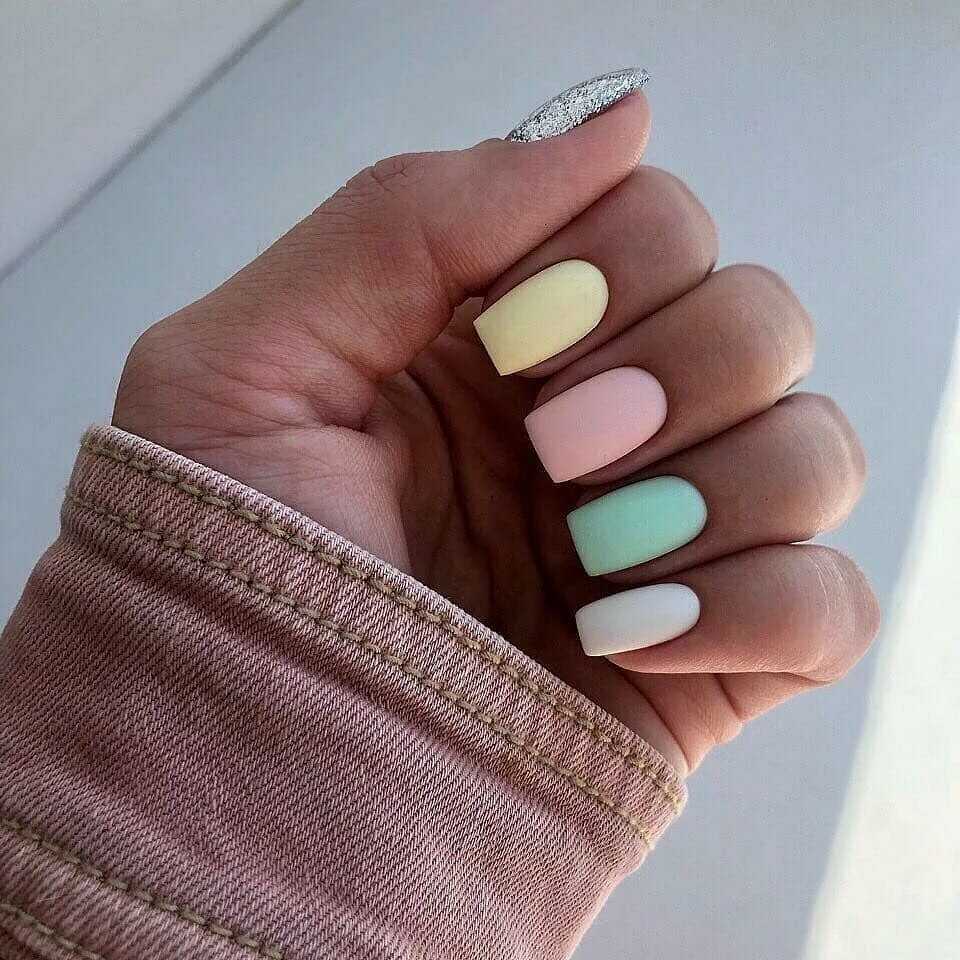 Тенденции нейл-арта уже научили нас тому, что иметь одинаковые ногти на всех пальцах больше не модно. Так что выбирайте разноцветный маникюр. Вы можете сочетать оттенки цветов на каждом ногте или использовать разные цвета, которые хорошо сочетаются друг с другом. Несоответствие цвета ногтей придает маникюру оригинальность и веселье.
