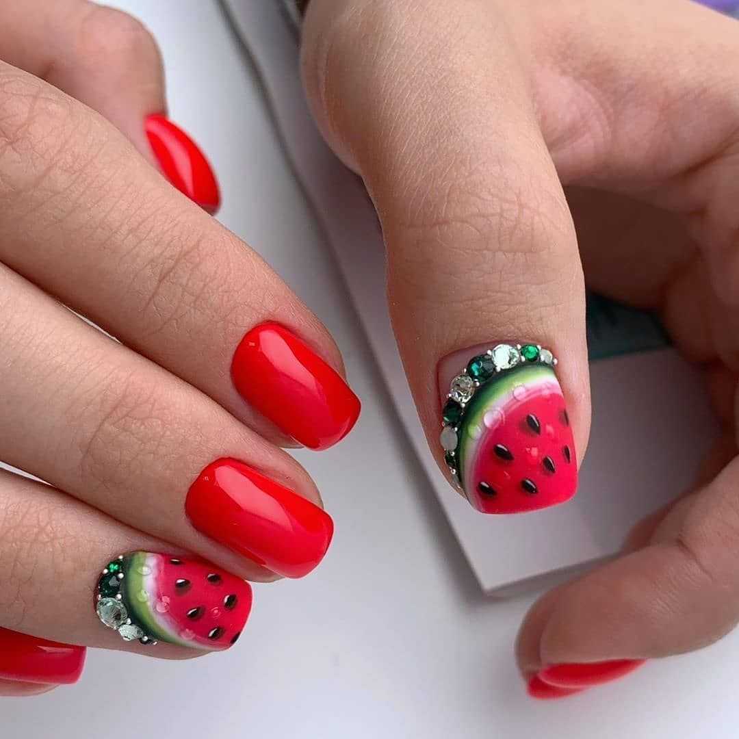 Летом всегда есть больше смелости, чтобы выразить себя через нейл-арт. Яркие, сочные оттенки лака становятся как никогда уместными и дополняют повседневные образы. Поэтому фруктовый дизайн однозначно подходит для квадратных ногтей разной длины. Самое главное – адаптировать рисунок так, чтобы он подчеркивал красоту дизайна. Убедитесь, что такой маникюр не останется без комплиментов, особенно если вы украсите его стразами или жемчугом стандартного размера.