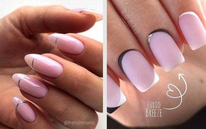 Однако и френч можно немного разбавить, добавив блеска или контрастных тонов. Особенно интересны варианты с использованием темных оттенков для выделения улыбки на коротких ногтях квадратной формы.