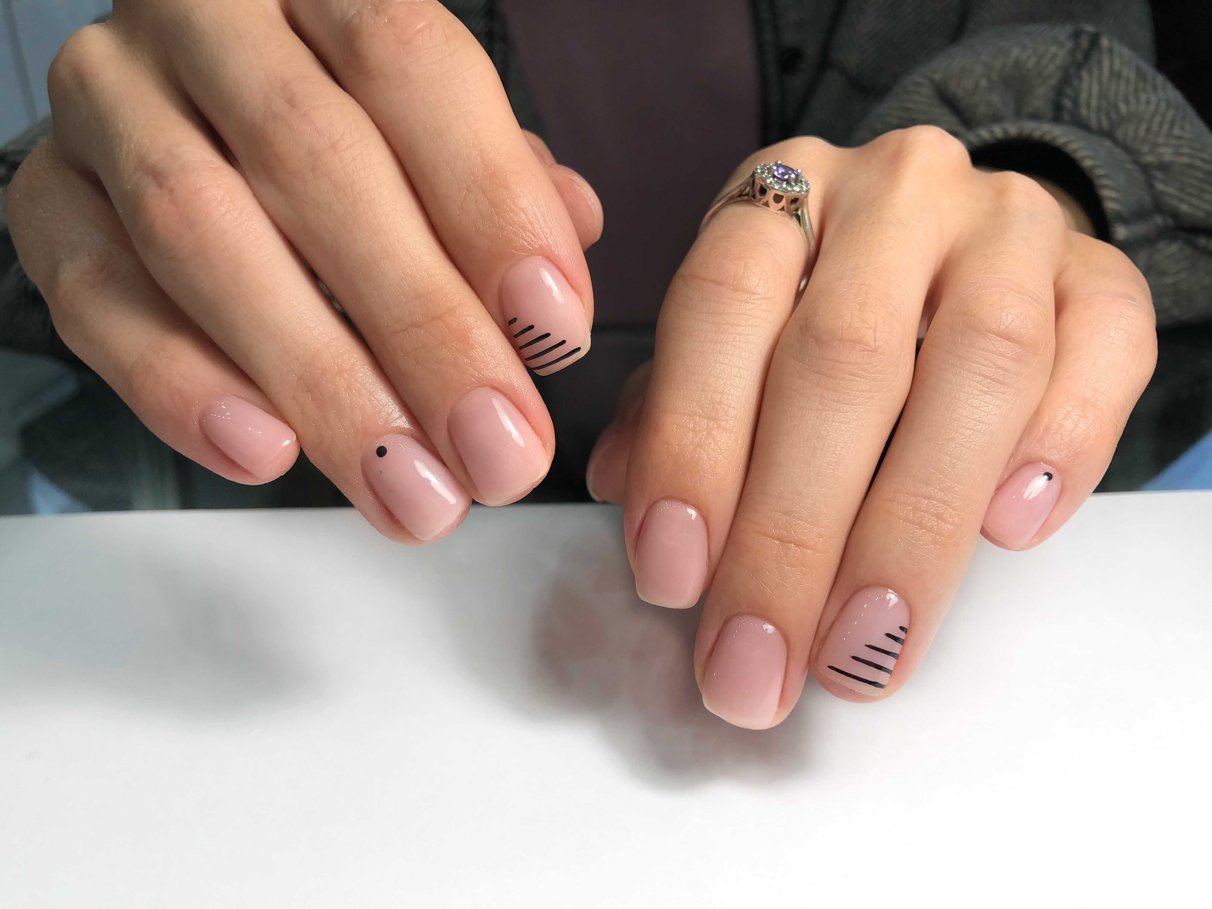 Нюдовый маникюр смотрится аккуратно и ухоженно в однотонном исполнении. Если вы добавите на свои ноготки легкие ненавязчивые штрихи в виде точек или графических фигурок контрастных цветов, получится креативный дизайн. С таким оформлением вы точно будете привлекать взгляды: маникюр подойдет к любому образу и будет уместен в любое время года.
