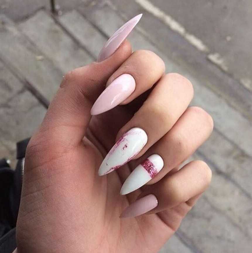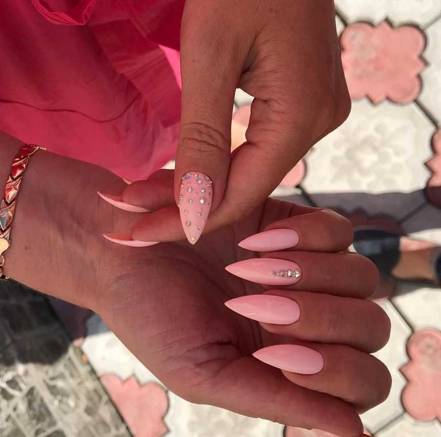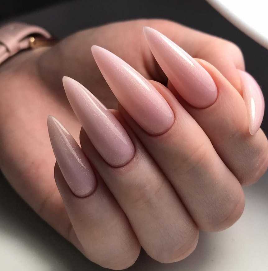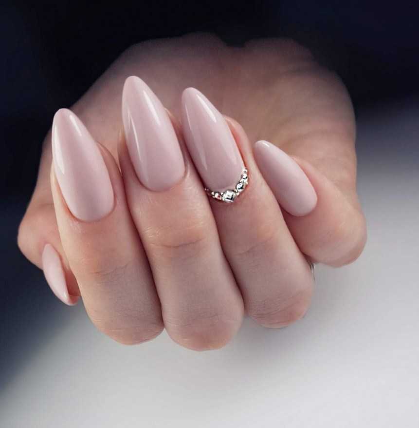 То, как выглядят острые ногти, уже само по себе привлекает внимание, поэтому даже однотонный гель-лак будет смотреться эффектно. Особенно хорошо маникюр подходит на длинные ногти, которые в классическом стиле не требуют дополнительных украшений