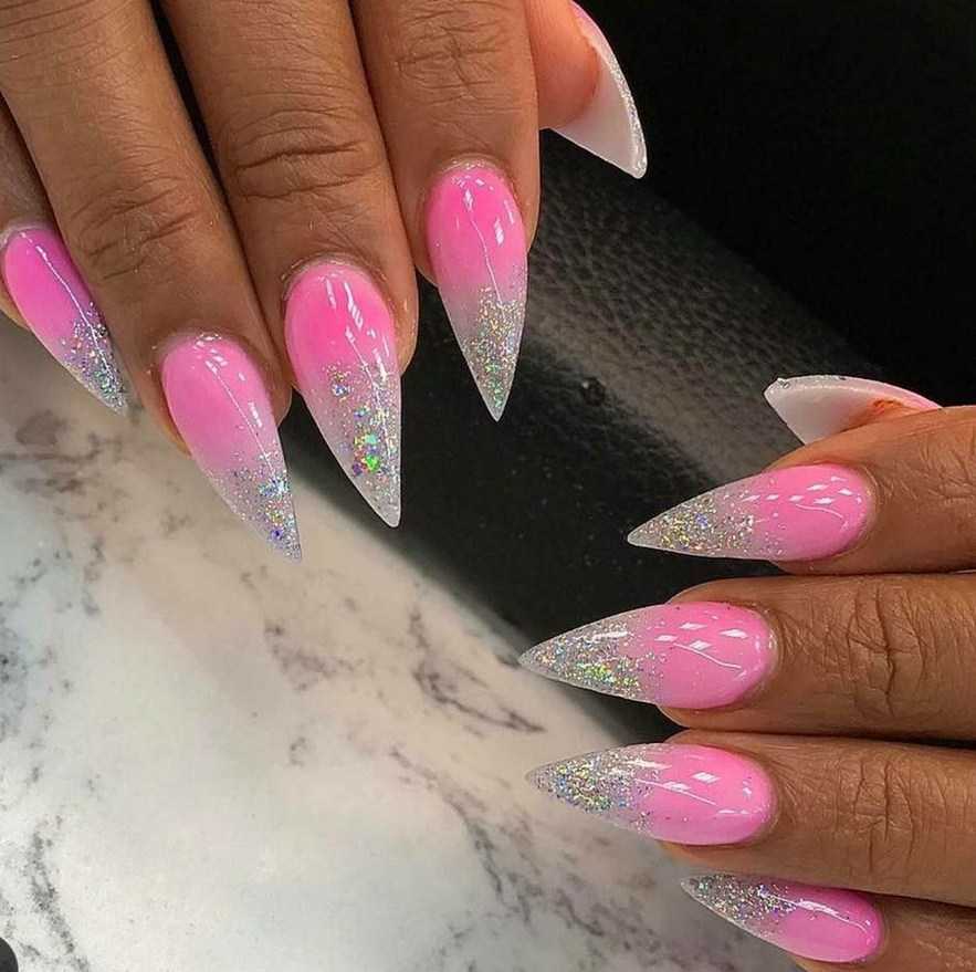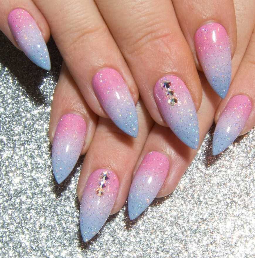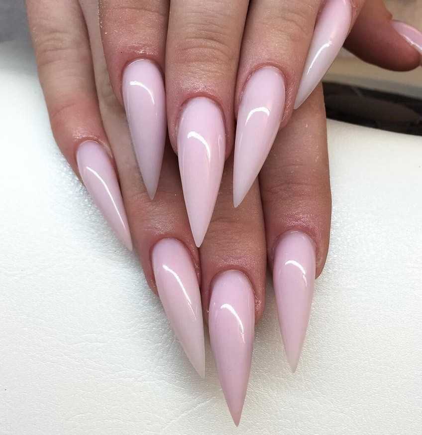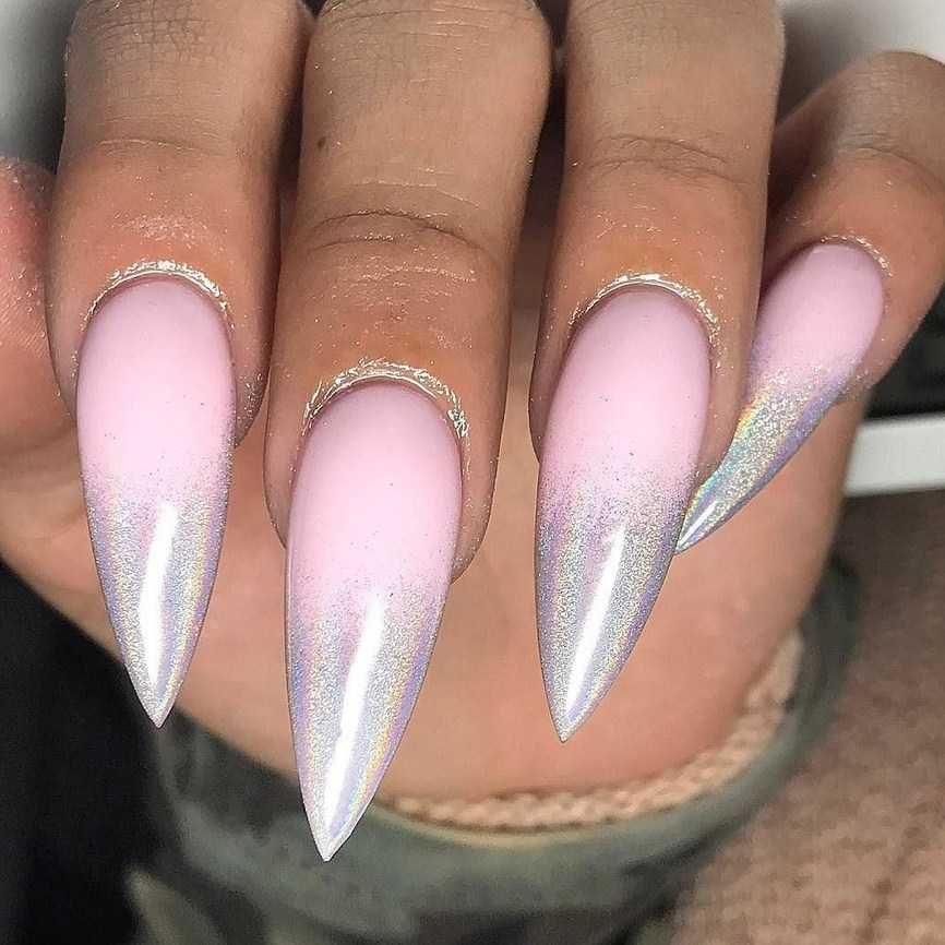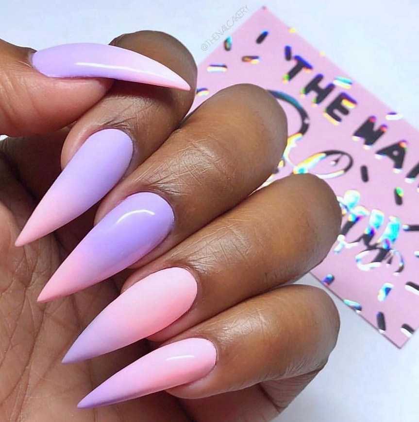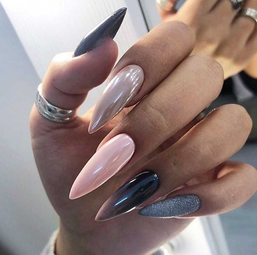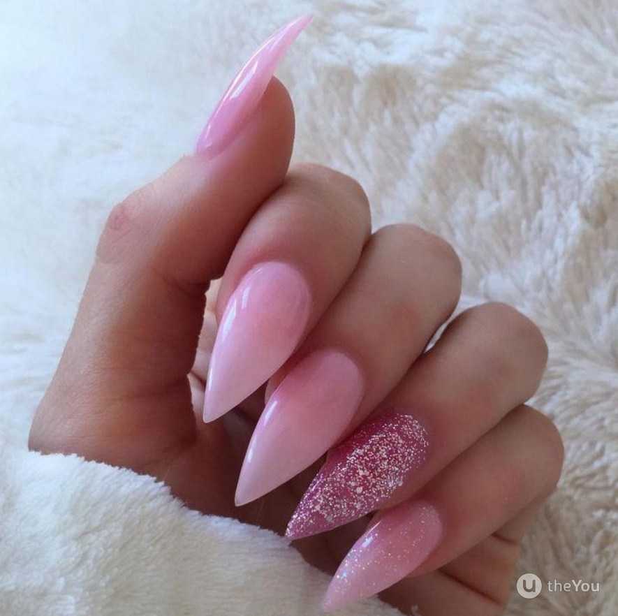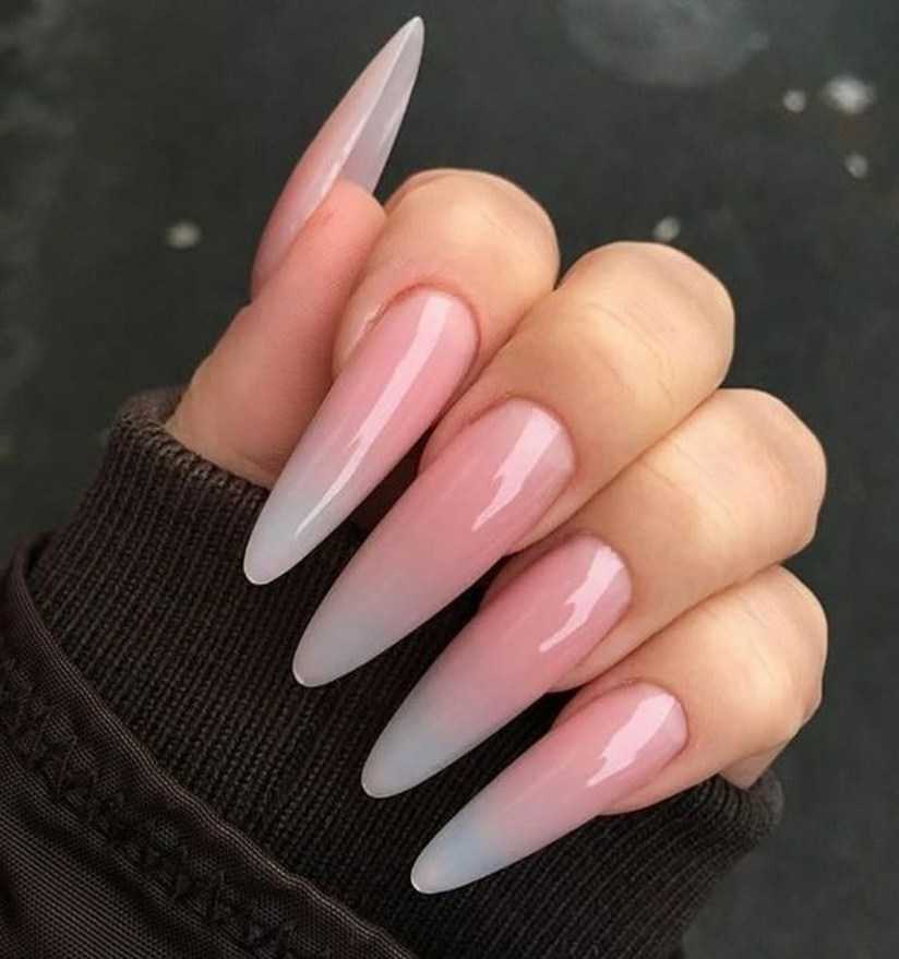 Дизайн омбре на стилетах выгодно подчёркивает форму и длину. Мастера советуют выбирать такую цветовую гамму, чтобы более тёмный фон шёл в направлении кончика – это даст эффект концентрации тона. Также на острых ногтях можно сделать омбре с растяжкой блёстками.