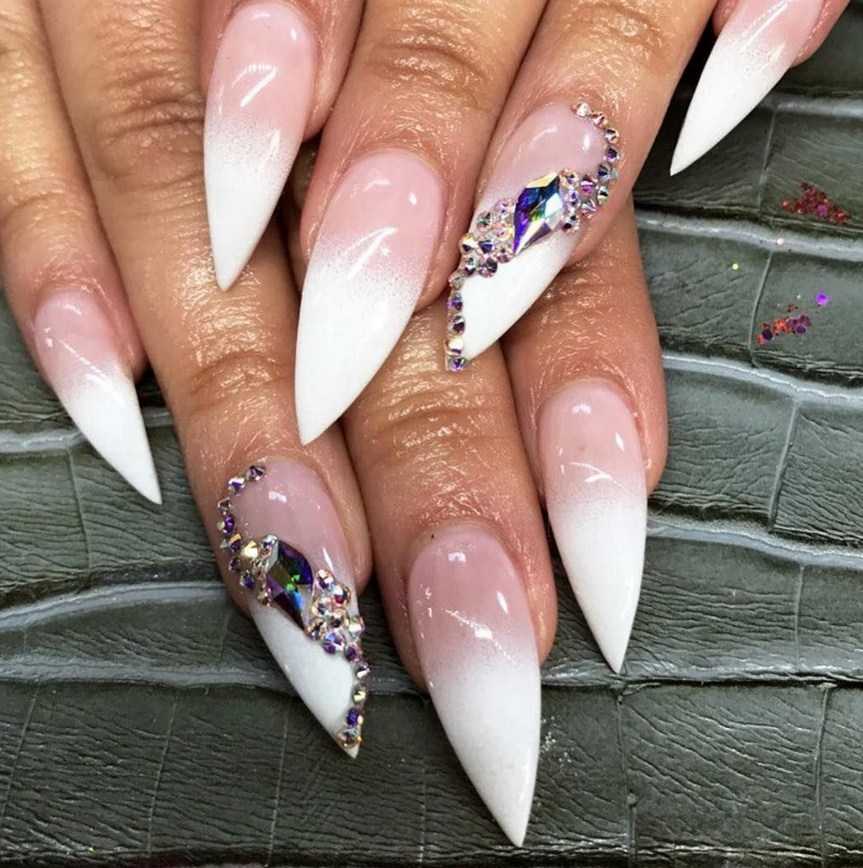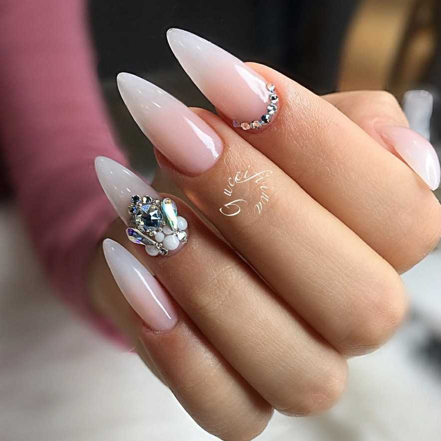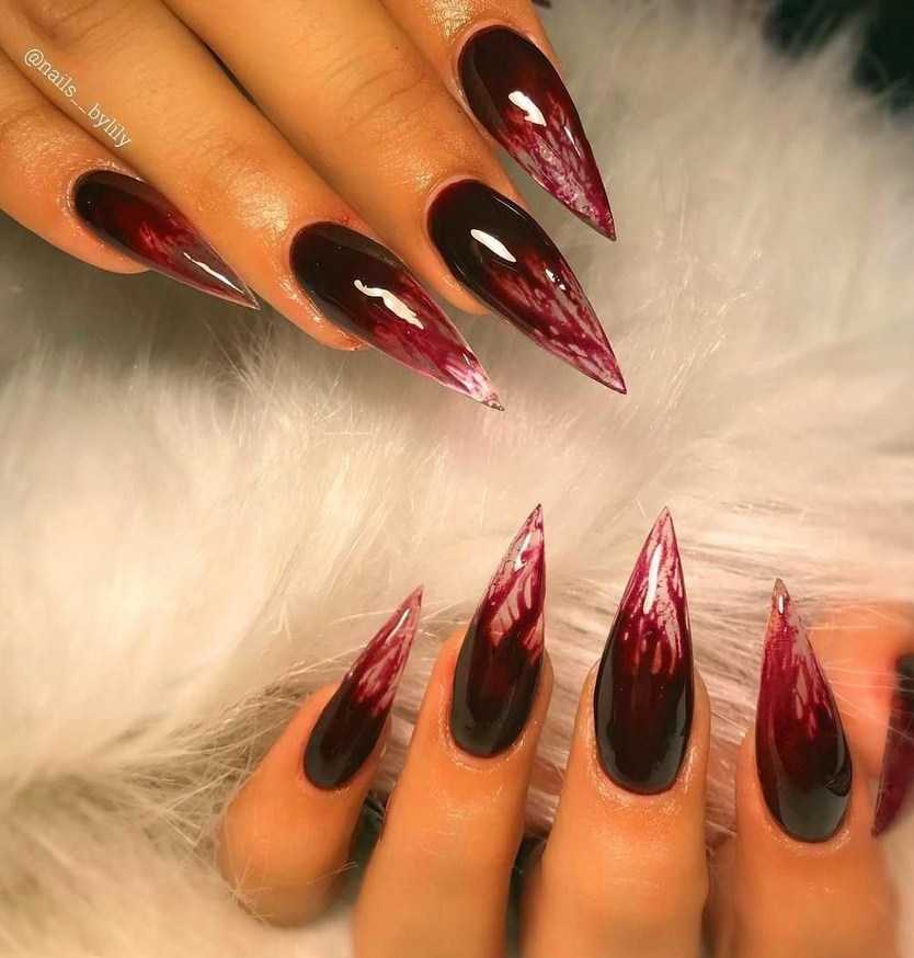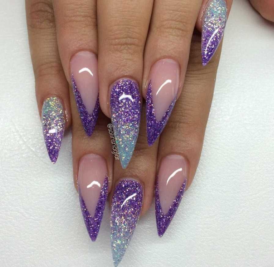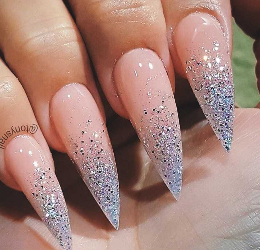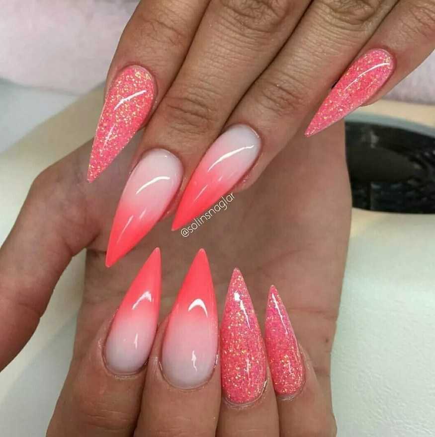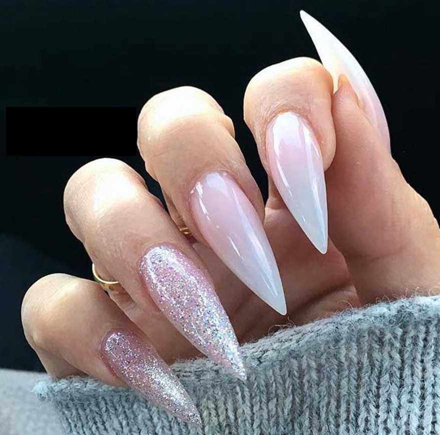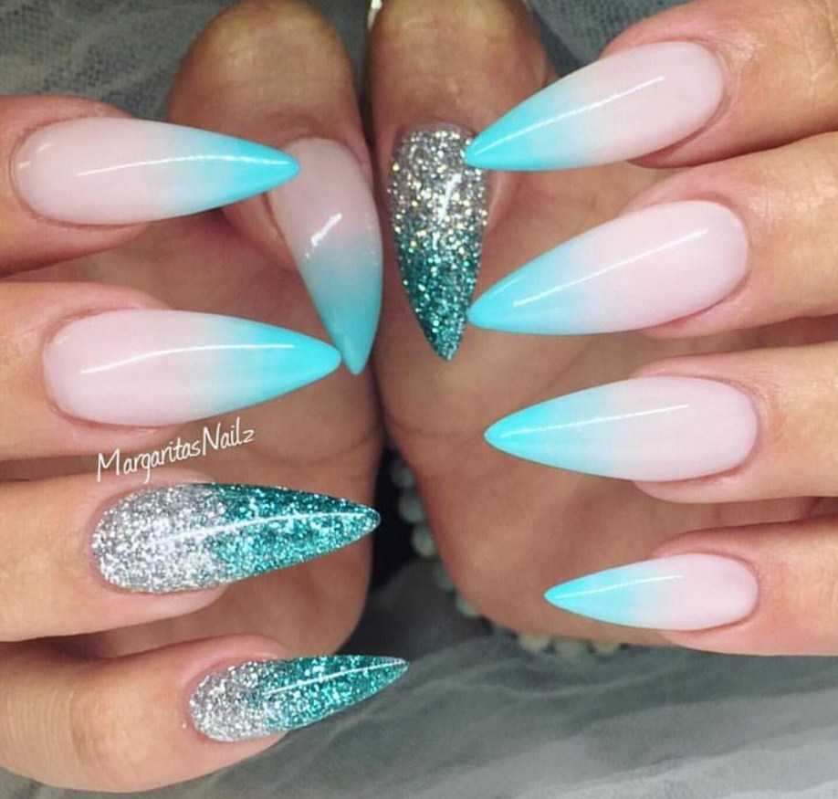 Дизайн омбре на стилетах выгодно подчёркивает форму и длину. Мастера советуют выбирать такую цветовую гамму, чтобы более тёмный фон шёл в направлении кончика – это даст эффект концентрации тона. Также на острых ногтях можно сделать омбре с растяжкой блёстками.