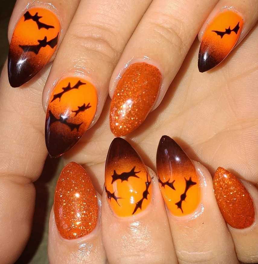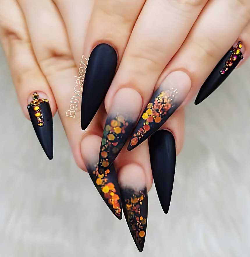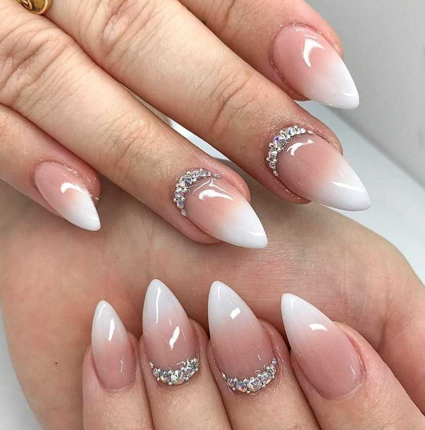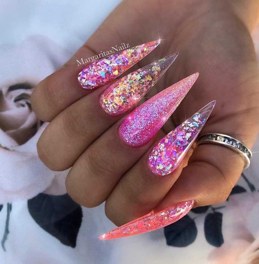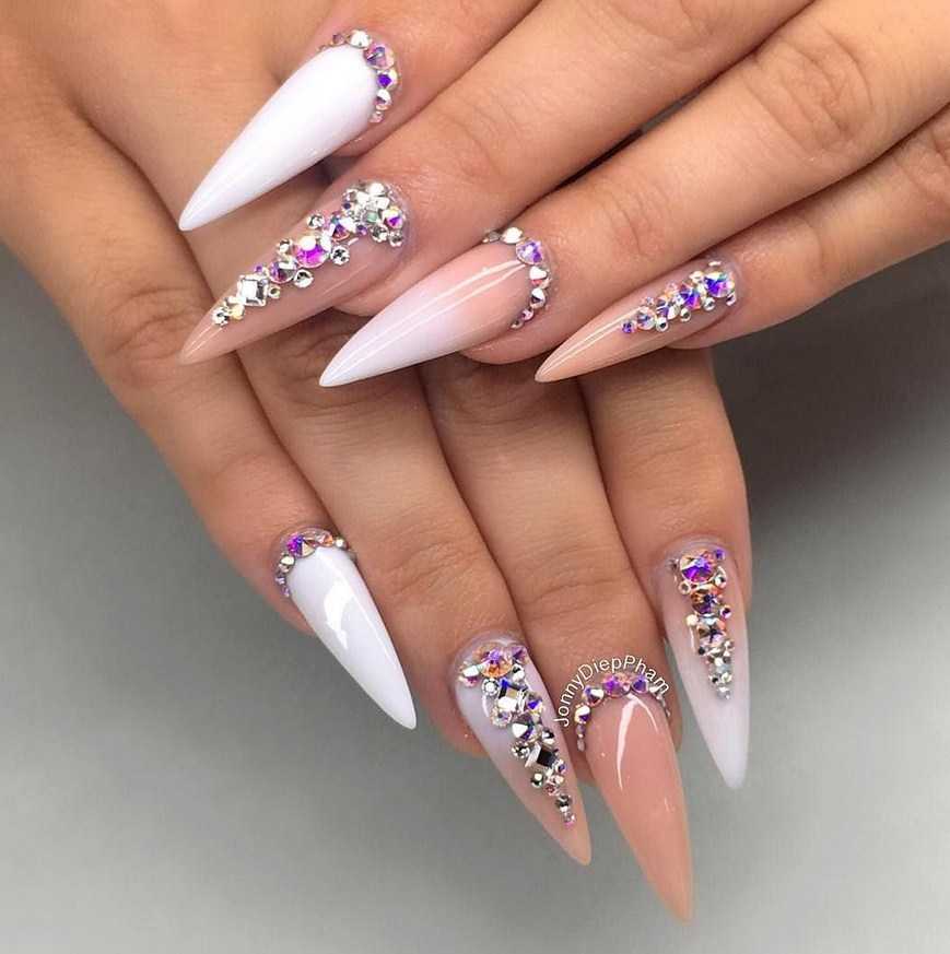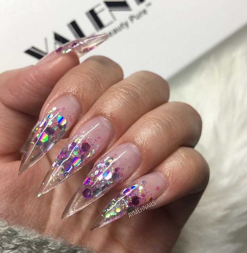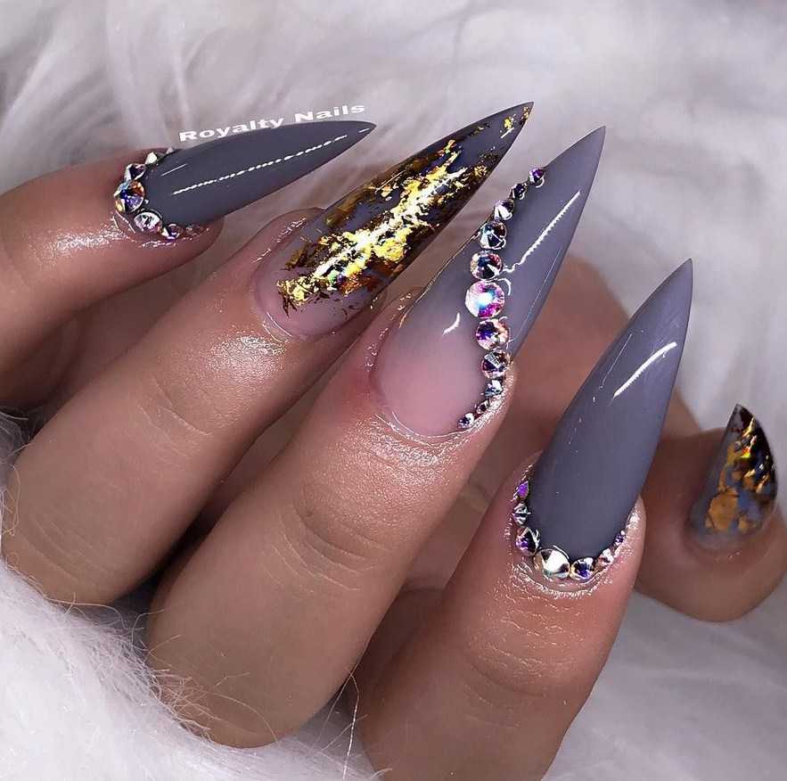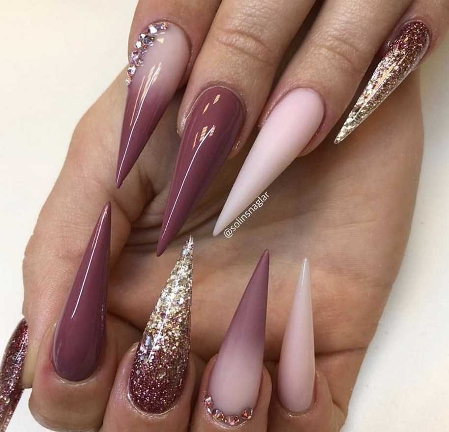 Дизайн омбре на стилетах выгодно подчёркивает форму и длину. Мастера советуют выбирать такую цветовую гамму, чтобы более тёмный фон шёл в направлении кончика – это даст эффект концентрации тона. Также на острых ногтях можно сделать омбре с растяжкой блёстками.