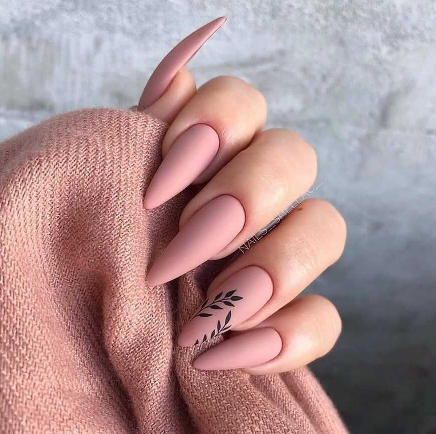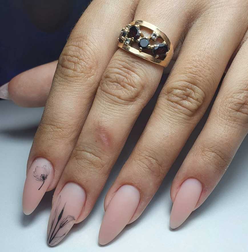 Для лаконичного нейл-арта можно покрыть ногти молочно-розовым оттенком. Указательный и средний пальцы сделать матовыми. На них же разместить парный рисунок нежной веточки, выполненный черным или синим лаком. Получится очень стильно, если ветка будет как-бы скользить по ногтям, спускаясь по бокам с кончика одного ногтя к лунке другого.