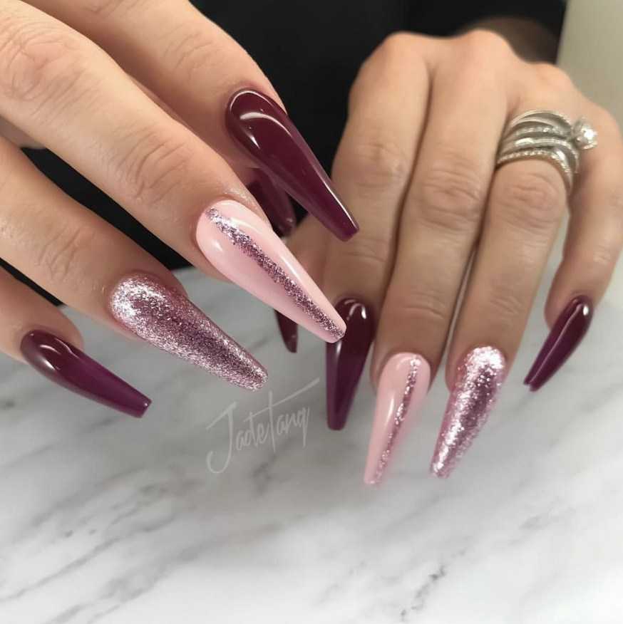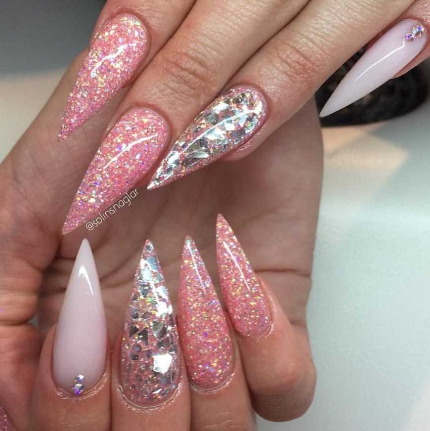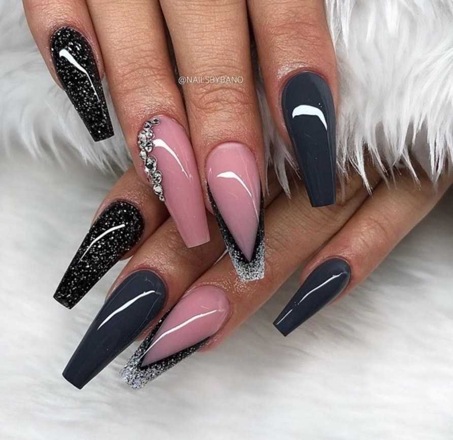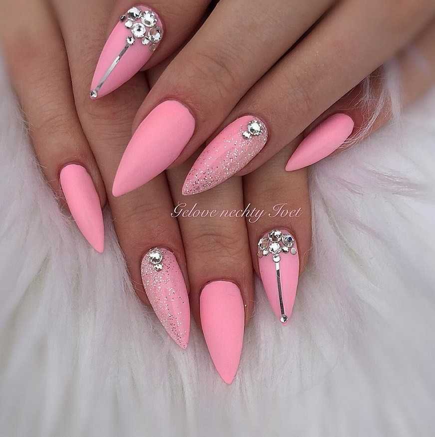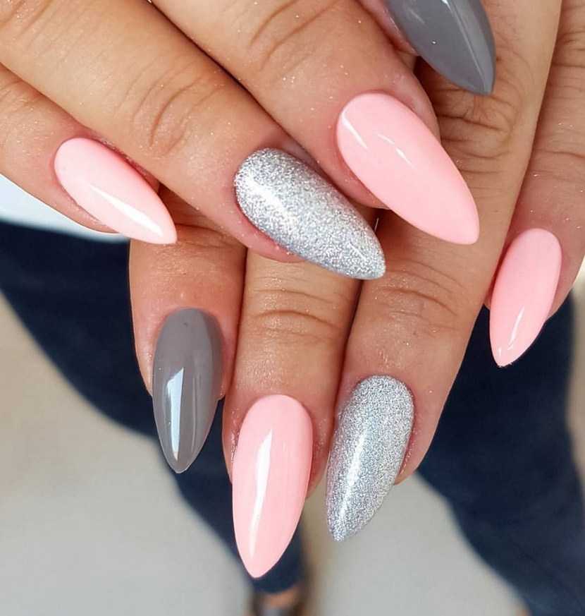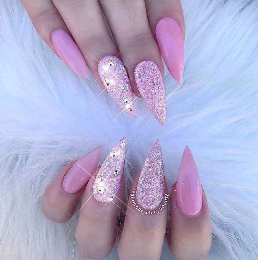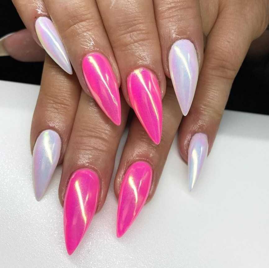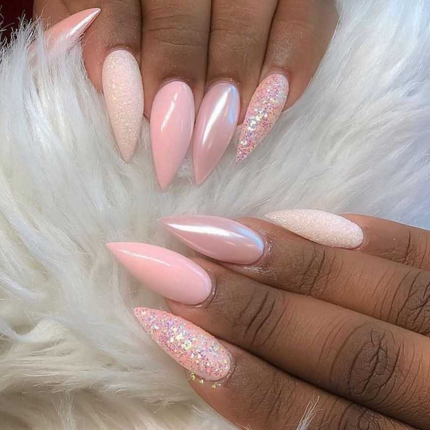 Розовый. Если хочется сделать маникюр ещё более дерзким, стоит взять яркий розовый оттенок покрытия. Для визуального сглаживания броскости самой формы, напротив, подбирают нежный розоватый тон, близкий к нюдовым. Стильные и качественные покрытия — ANNY, тон № 173, Deborah Lippmann, тон «Фуксия с шиммером».