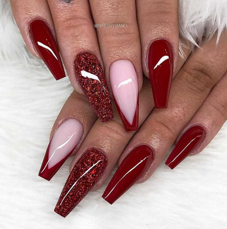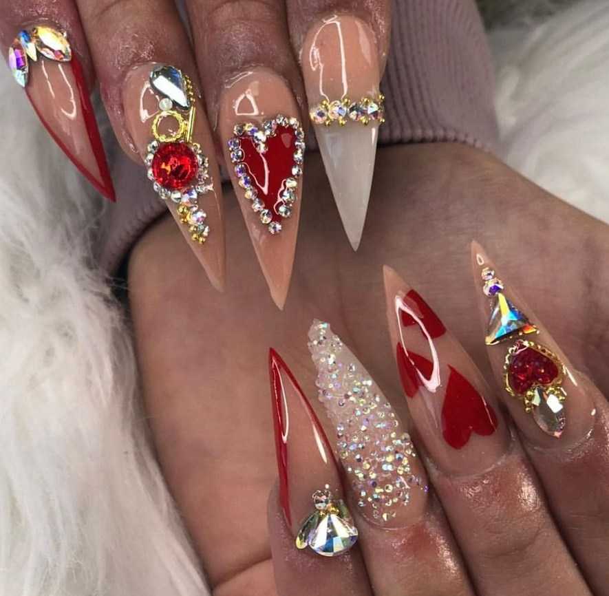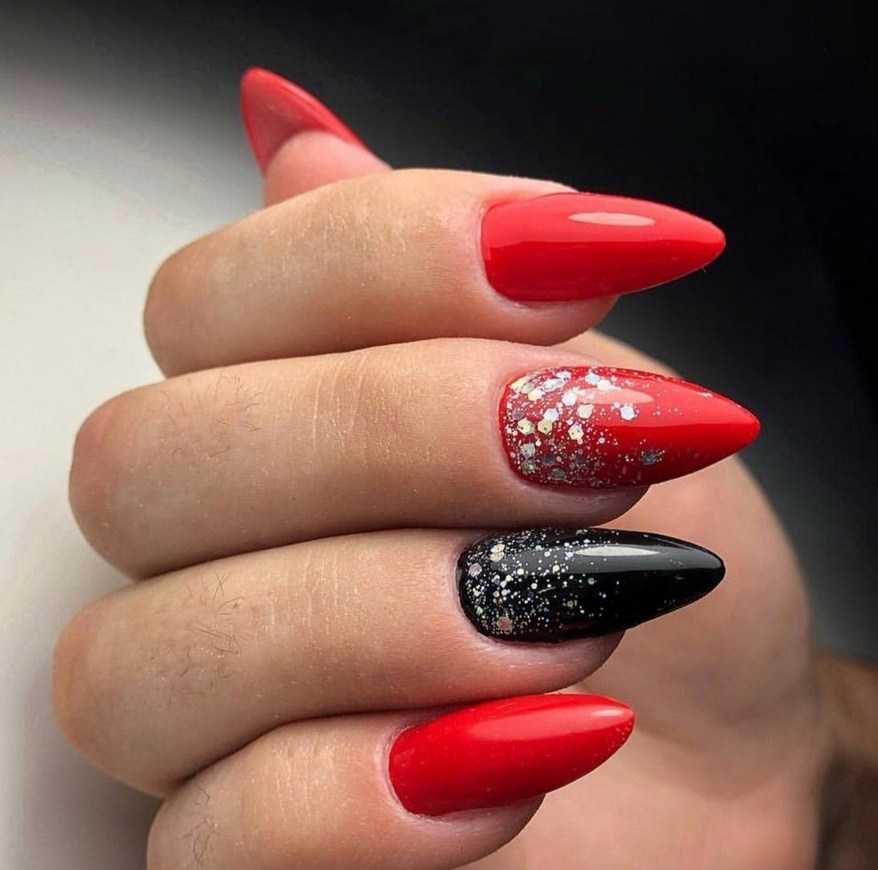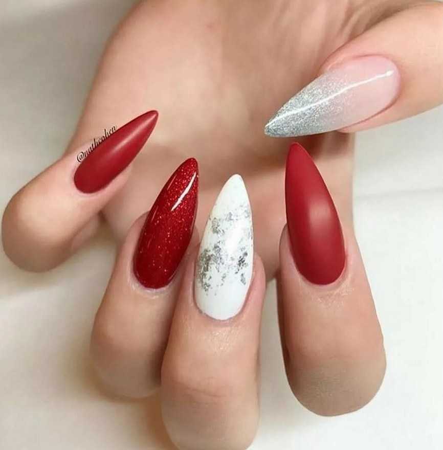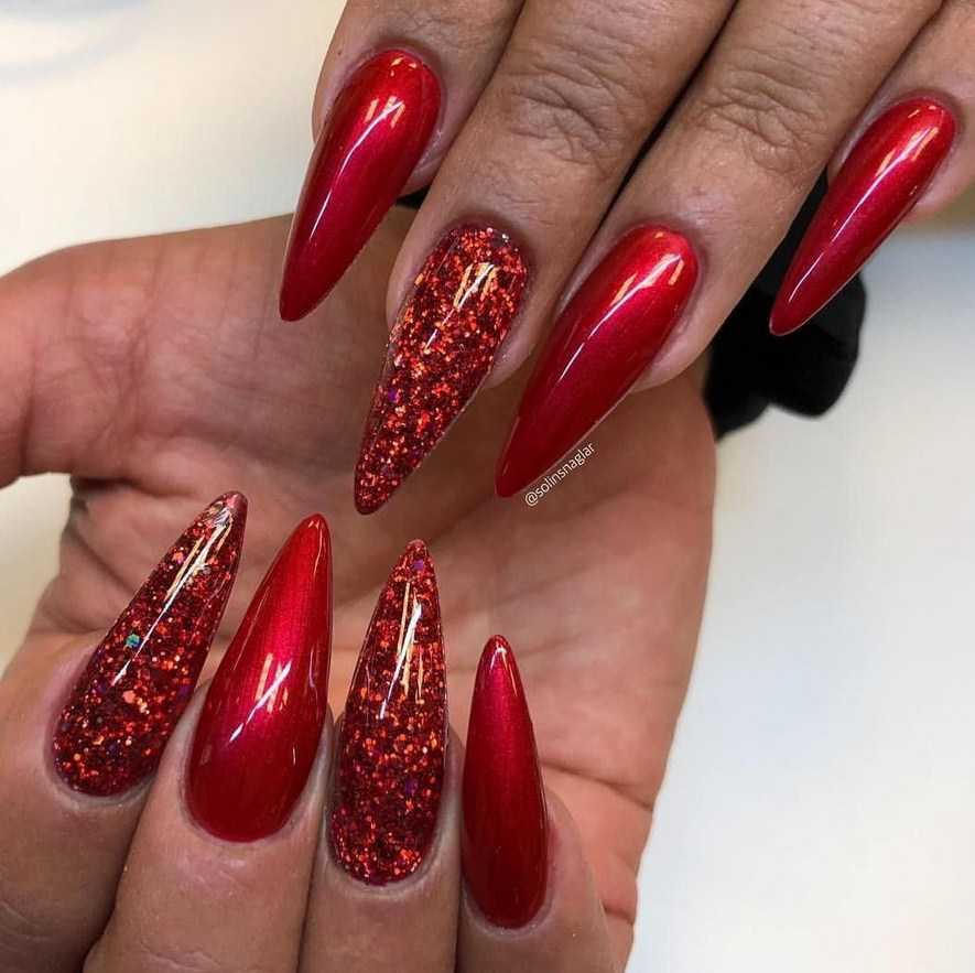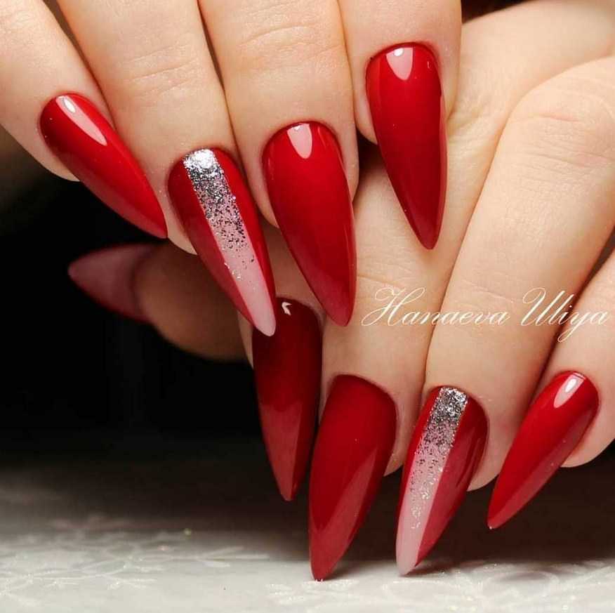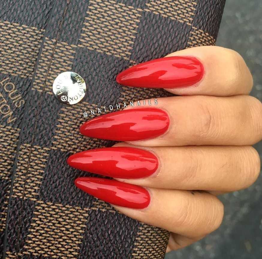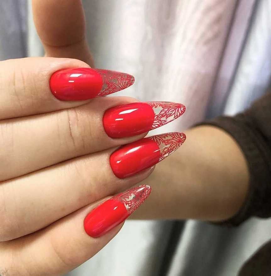 Яркий красный. Для маникюра острых ногтей походят все варианты красного – от вишнёвого до бордового и брусничного. Чем ярче покрытие, тем меньше должно быть дополнительных элементов и украшений. Достаточно пары акцентов, например, капельки блёсток или мелкого рисунка из стразов. Красивые тона лаков — Iva Nails, №1 Red Queen, Nartist, №320.