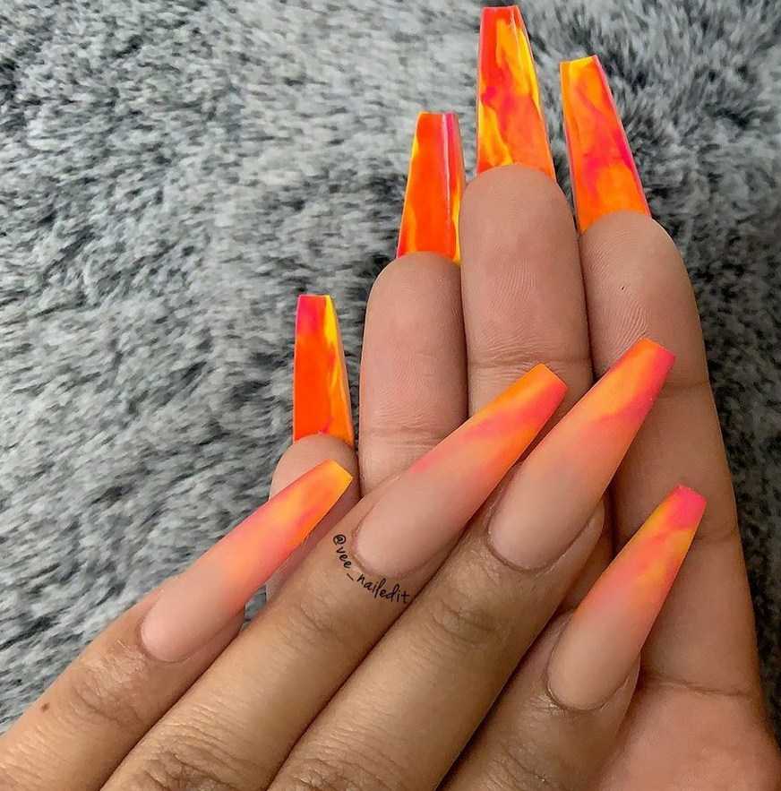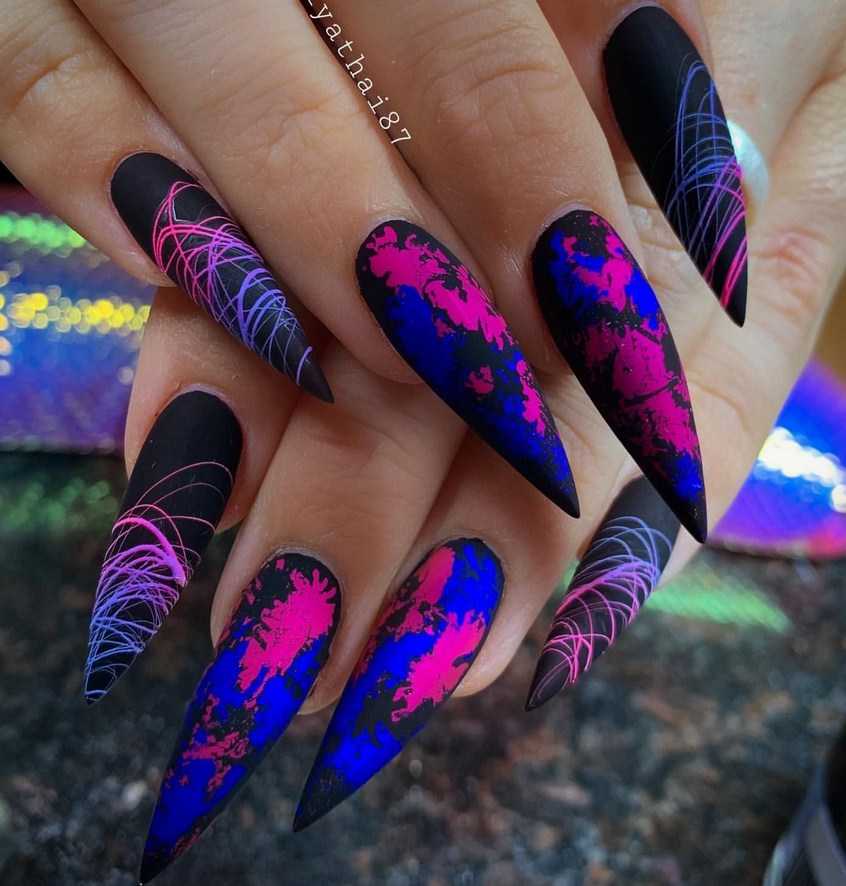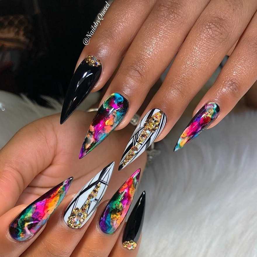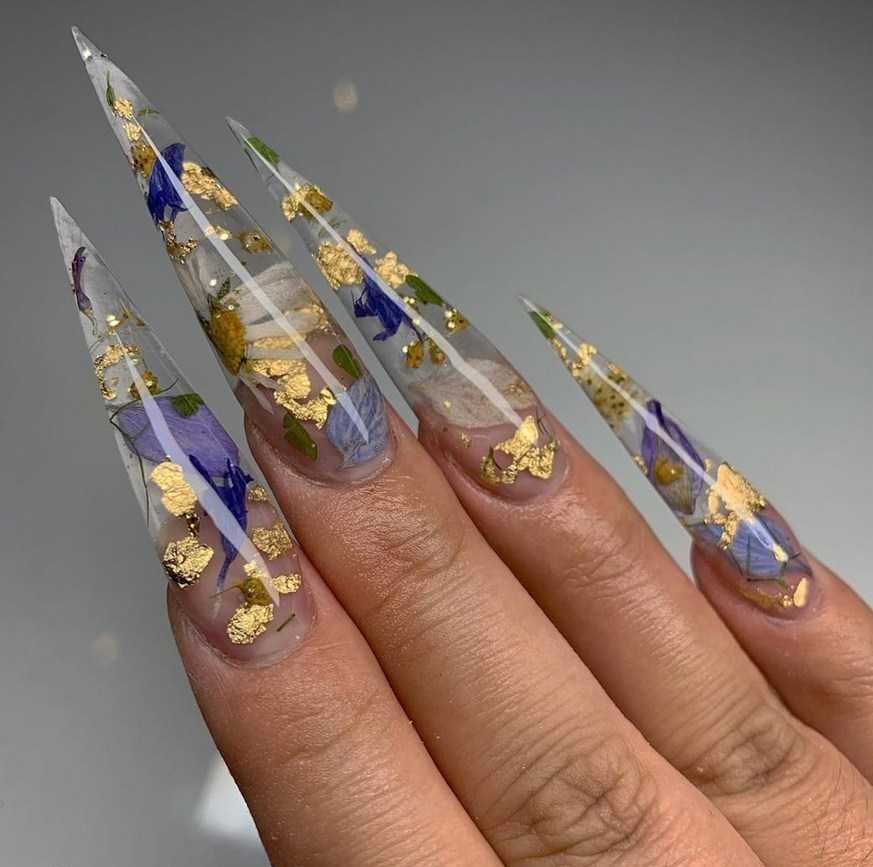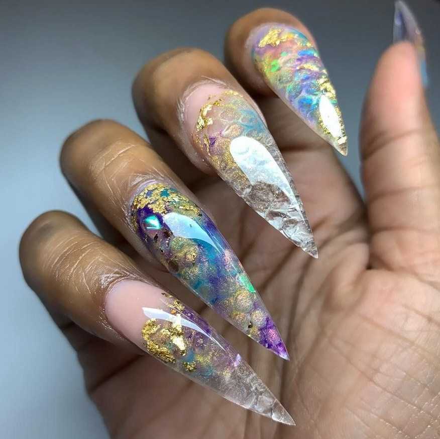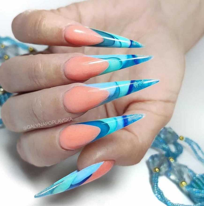 Рисунок на острых ногтях выполняют между двумя слоями прозрачного лака, геля. В результате пластины выглядят будто бы опущенные в воду, а декор – как нанесённый акварельными красками. Такой нейл-арт актуален в 2023 и вряд ли выйдет из моды в ближайшее время.