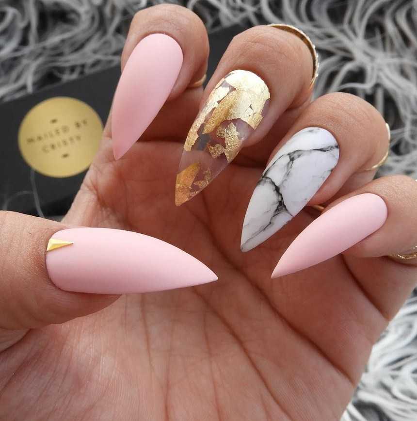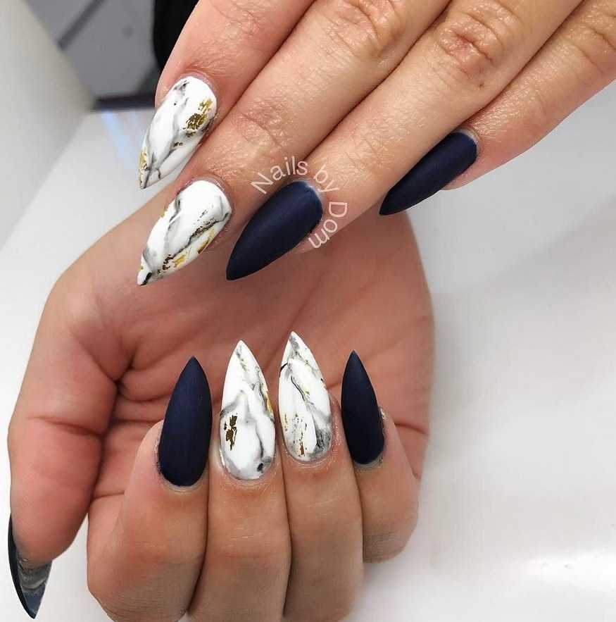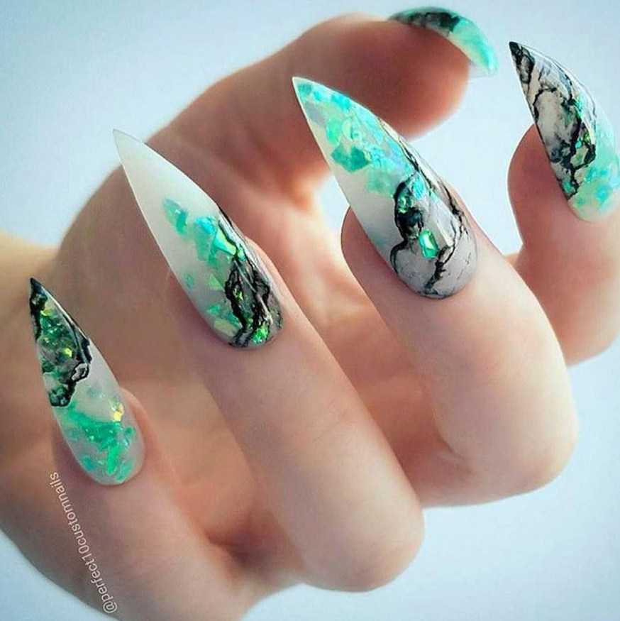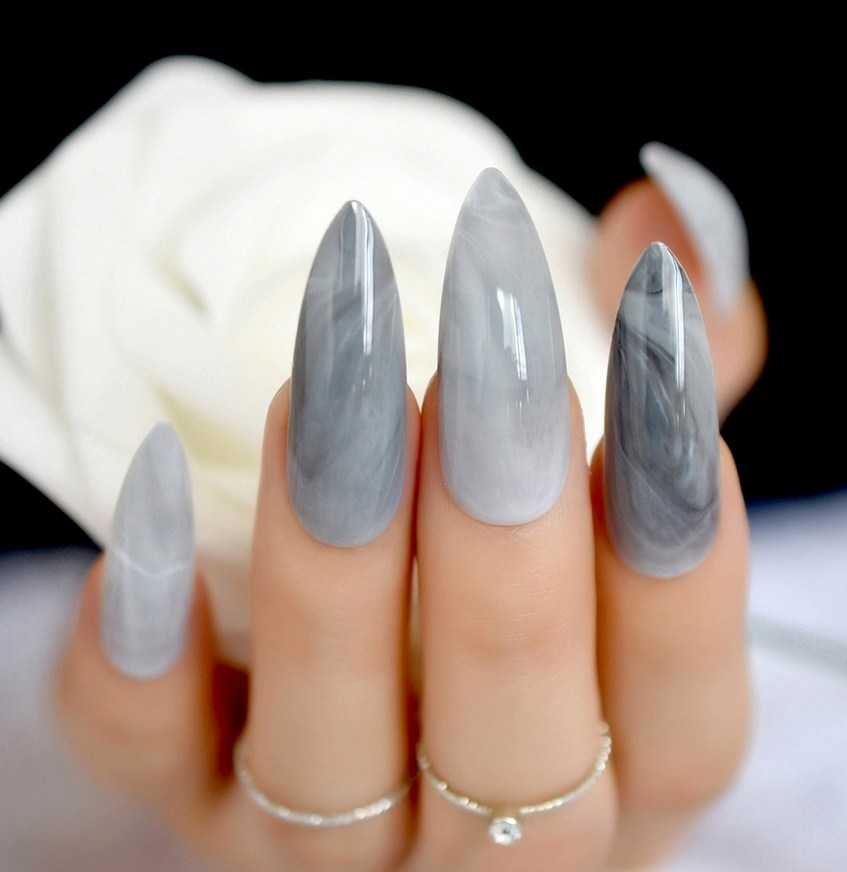 Структура камня отлично сочетается с видом длинной ногтевой пластины, а на острых мраморных ноготках становится настоящим акцентом образа.