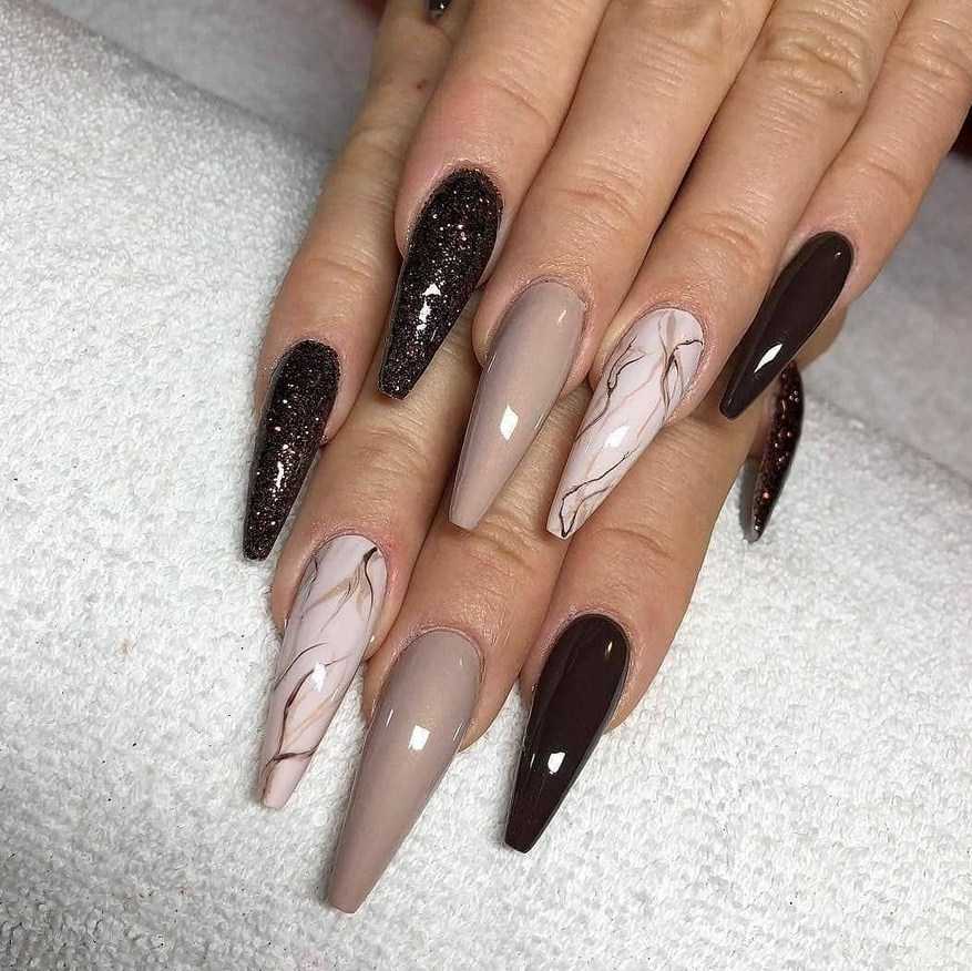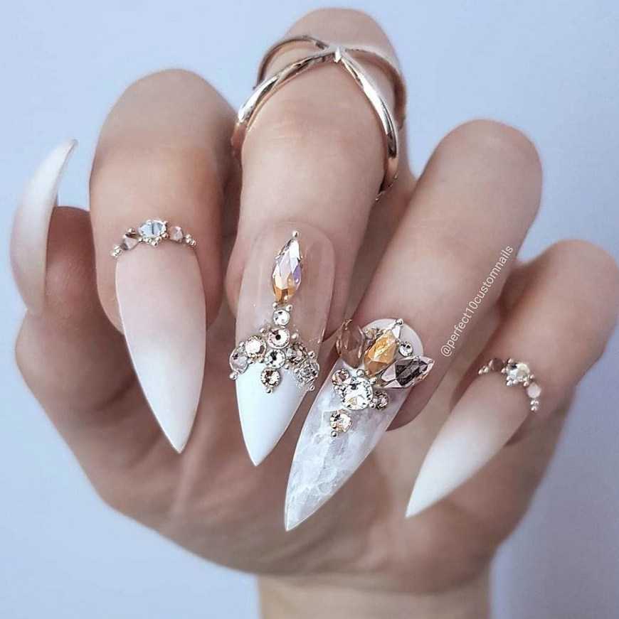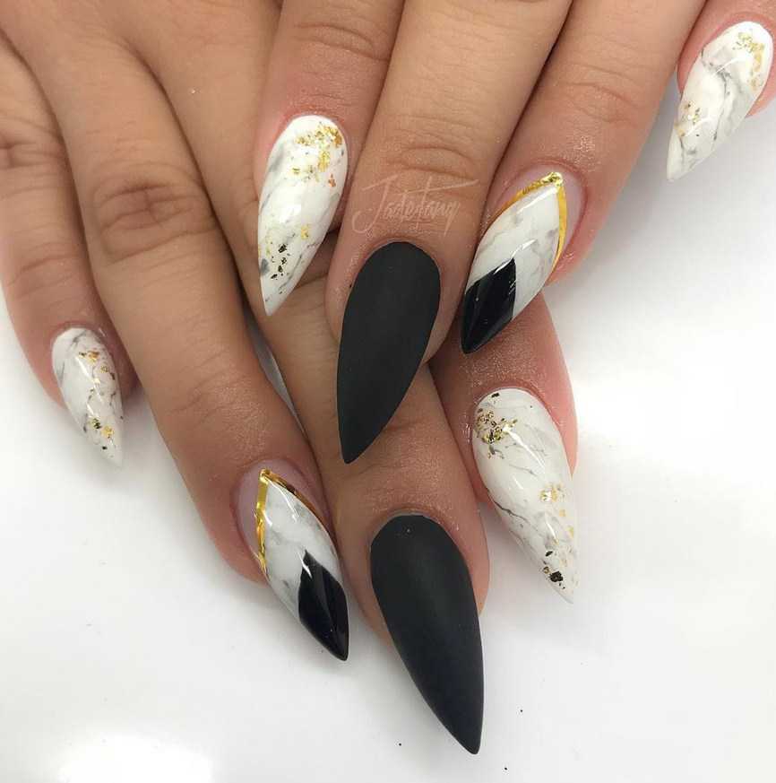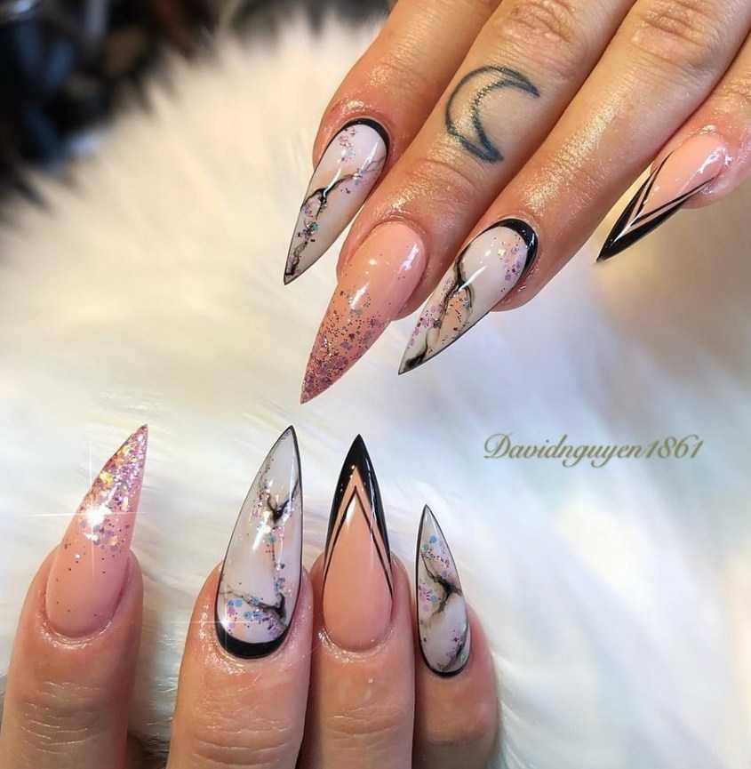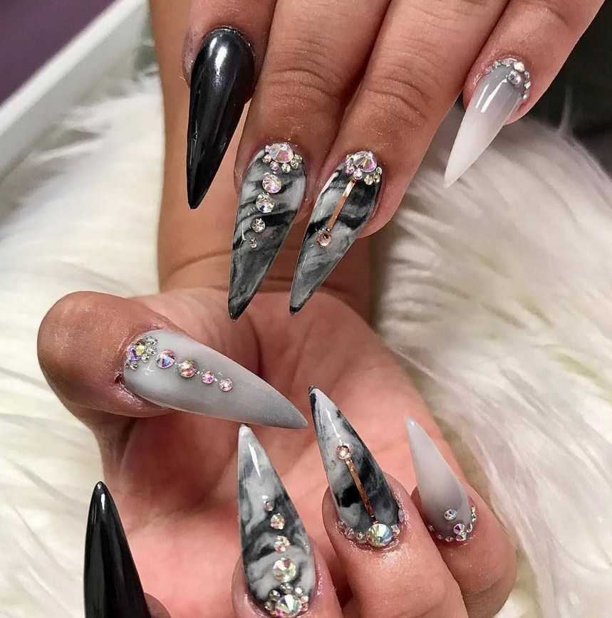 Структура камня отлично сочетается с видом длинной ногтевой пластины, а на острых мраморных ноготках становится настоящим акцентом образа.