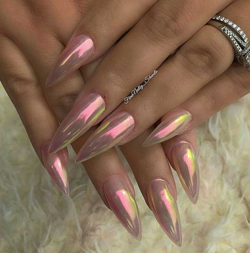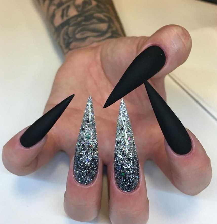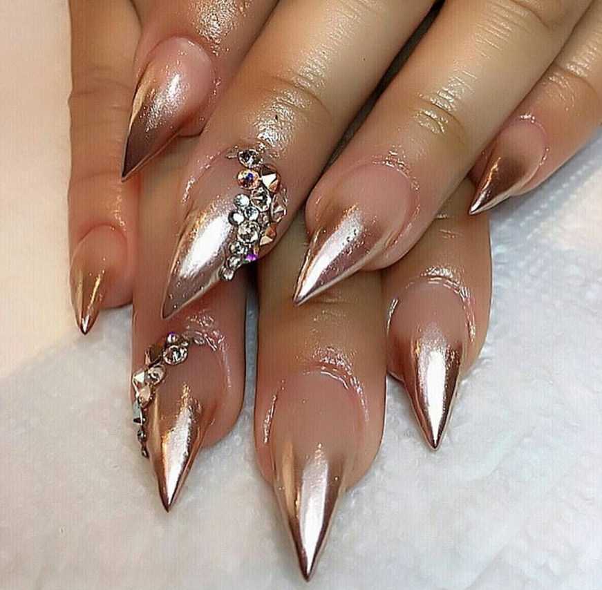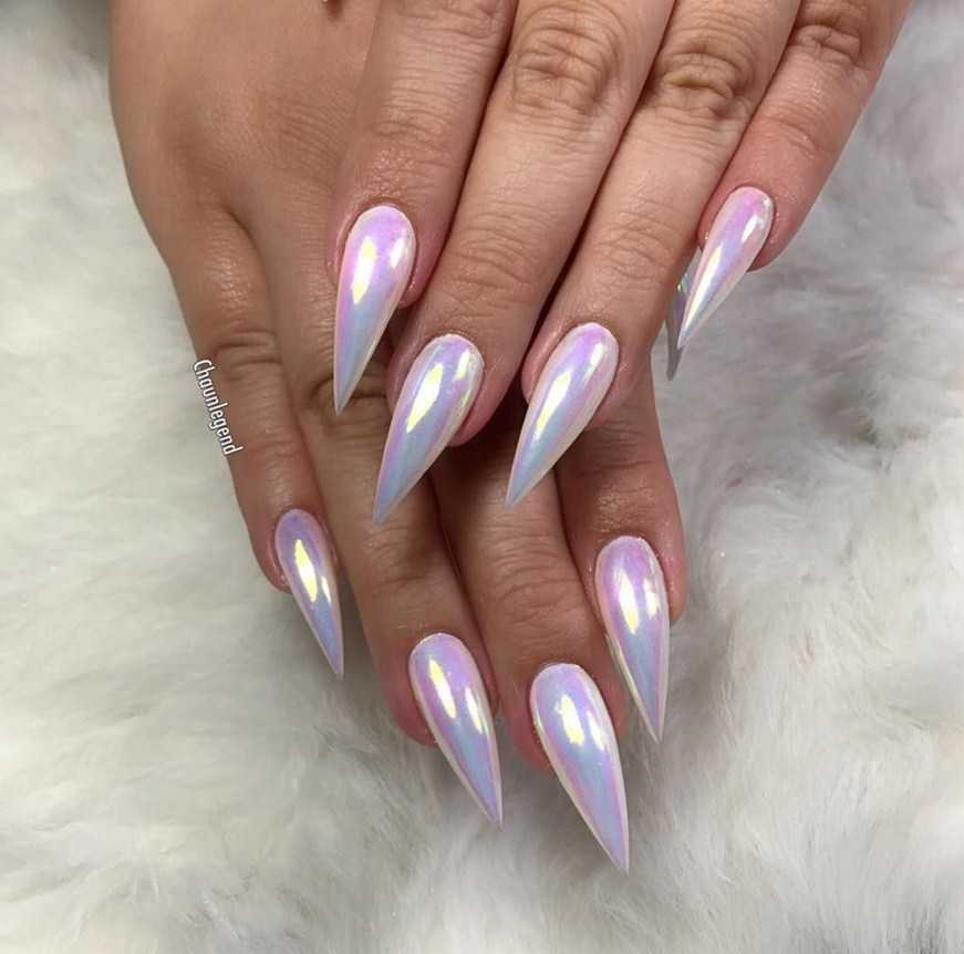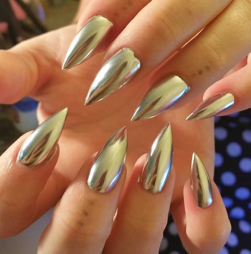 Очень острые ногти (пики). Если миндаль считается самой мягкой вариацией острых ногтей, то пики – наиболее агрессивная, дерзкая. Кончики получаются действительно тонкими и резко заострёнными, линии смягчения маникюра минимальны. Подобные ноготки подходят только для большой длины и, как правило, укрепляются гелем, иначе они могут быстро отломиться.