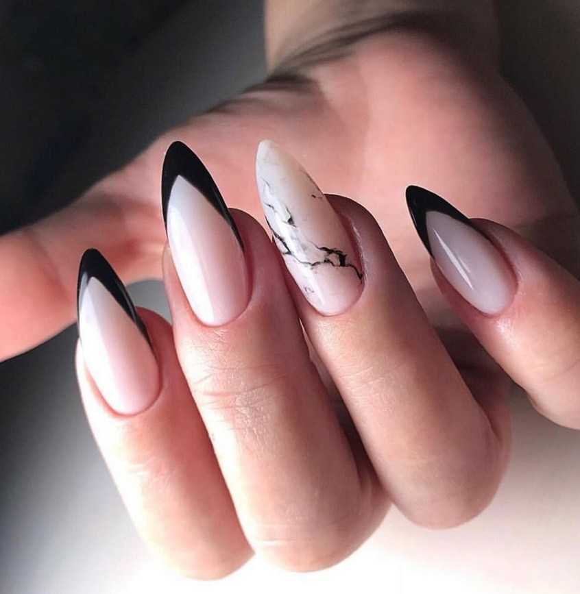 Разбавить спокойный и нежный вид ногтей можно с помощью черного цвета. Его должно быть немного. Это могут быть: небольшие полосы; узоры и орнаменты; геометрические фигуры. Материал – гель-лак, акриловая краска, слайдеры, трафареты.