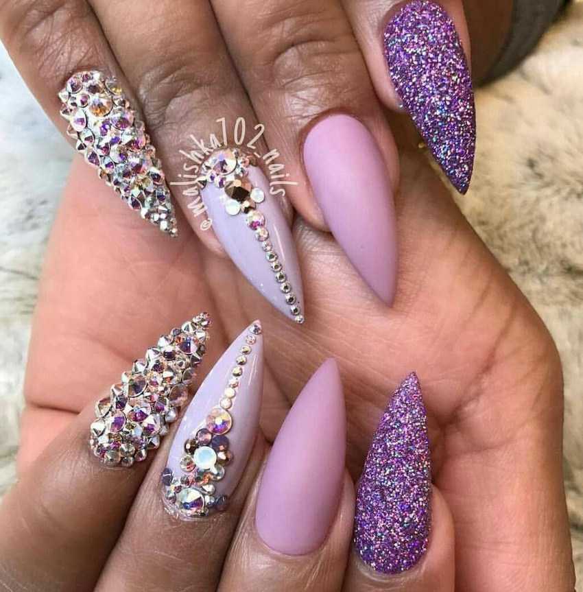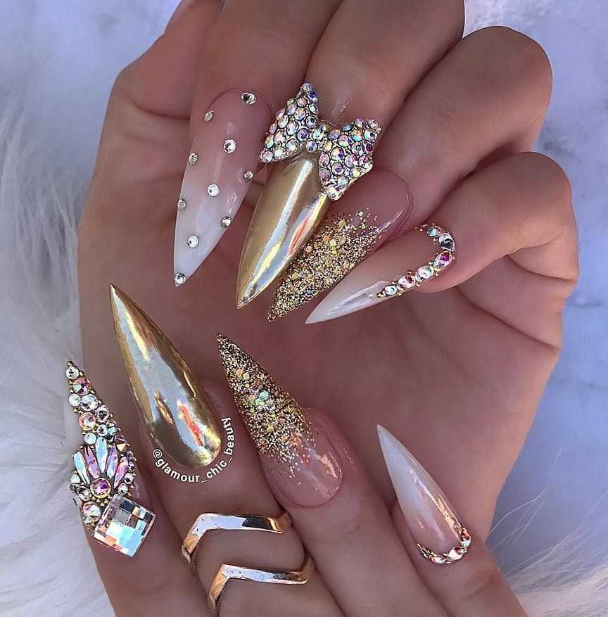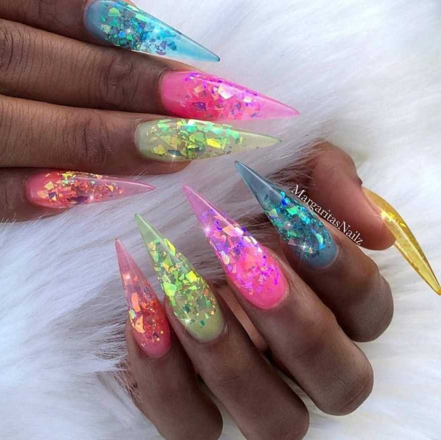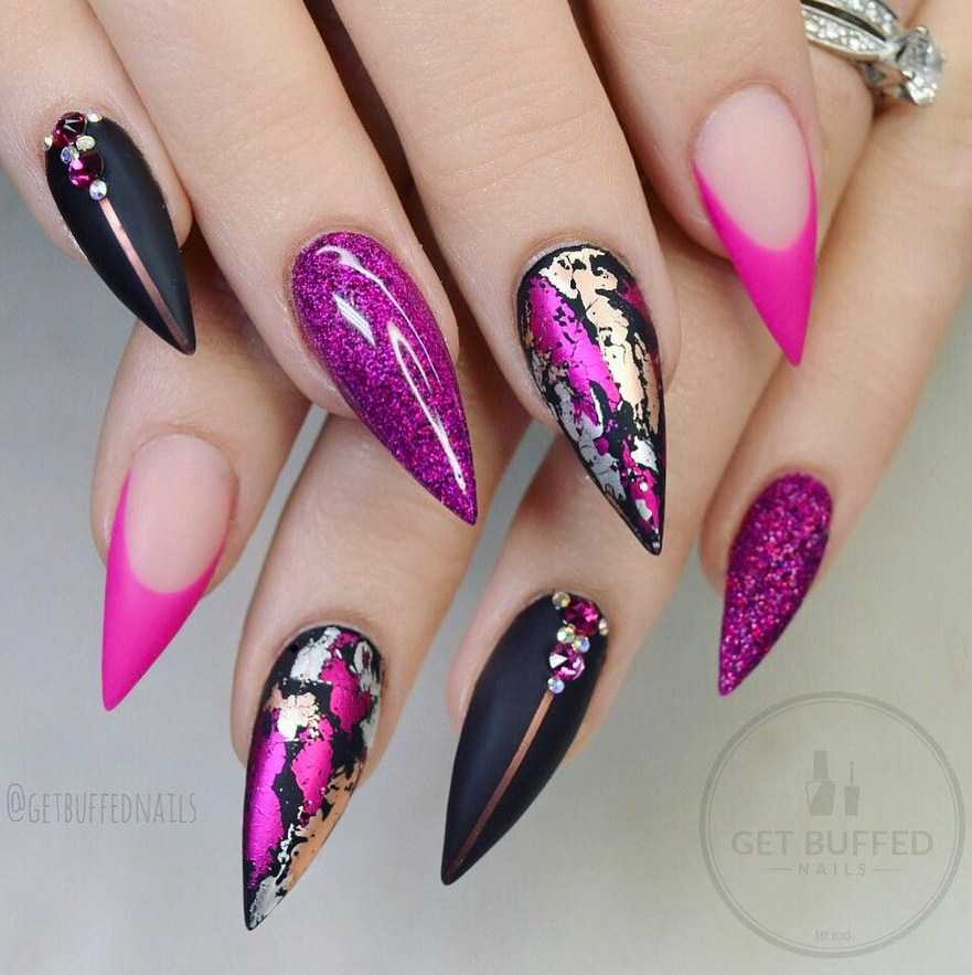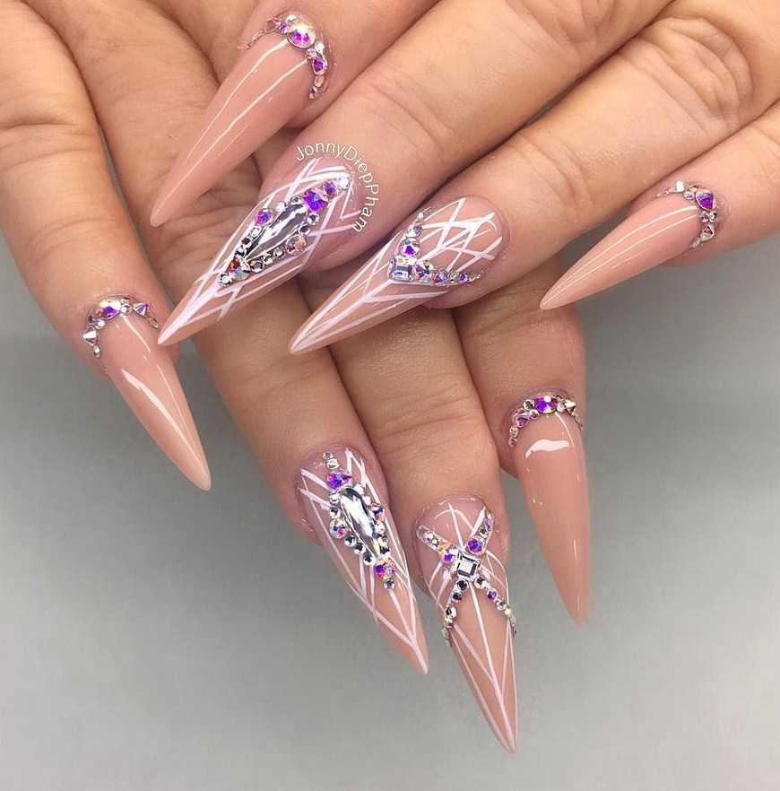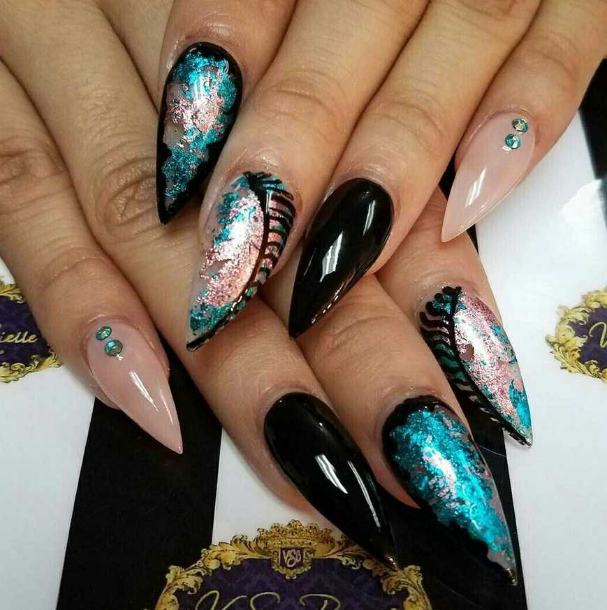На длинные ногти. Когда длина ногтевых пластин позволяет экспериментировать, возможны самые разнообразные способы подпиливания. Можно сделать пики, пуанты, заострённый миндаль – как подсказывает фантазия. При выполнении дизайна стоит быть аккуратнее и не переусердствовать с яркостью и количеством украшений.