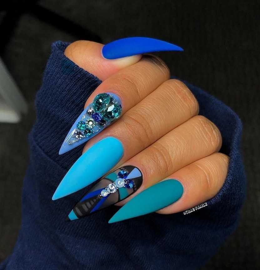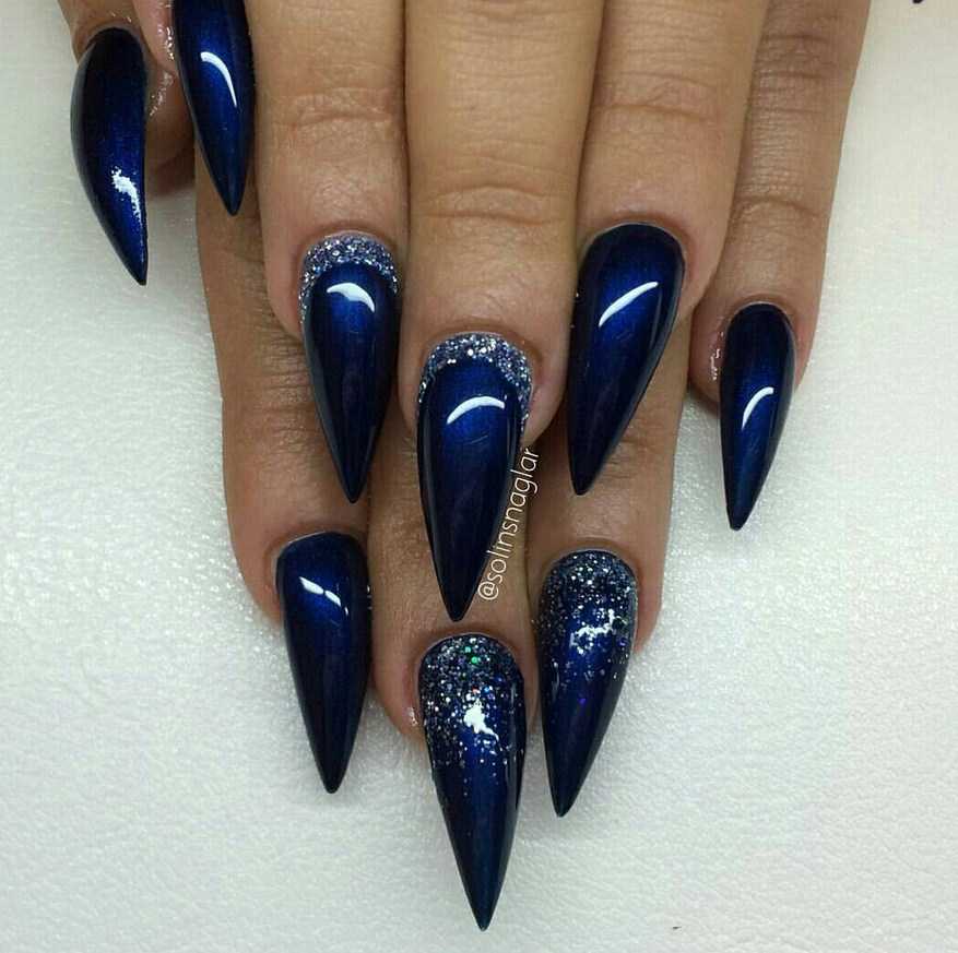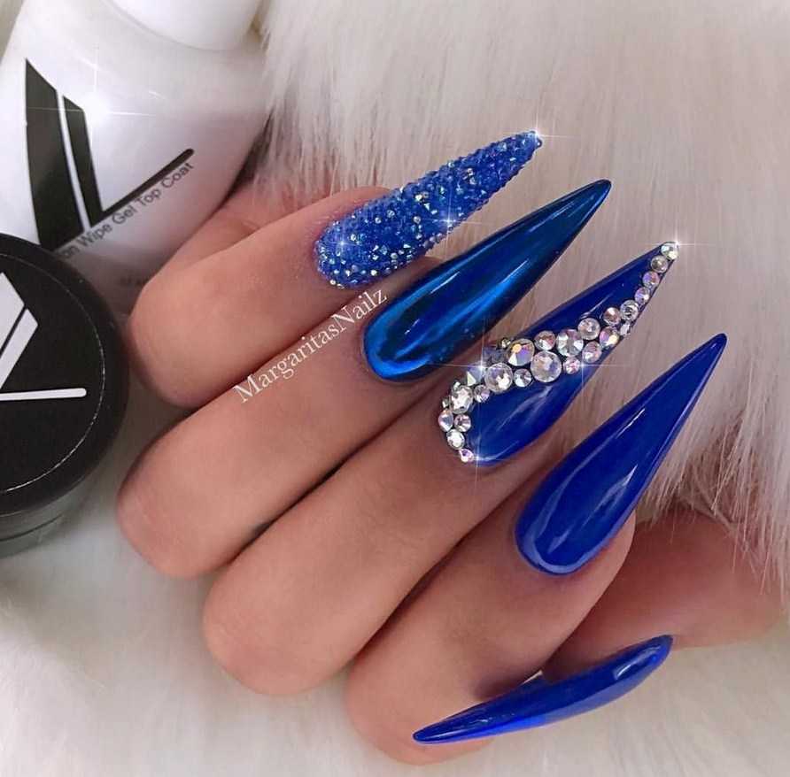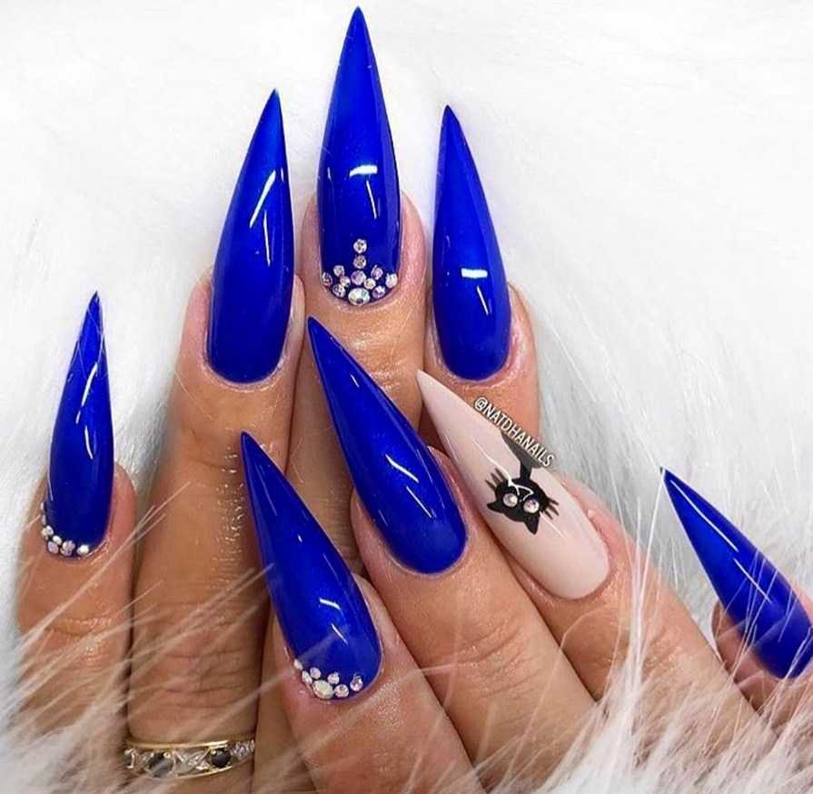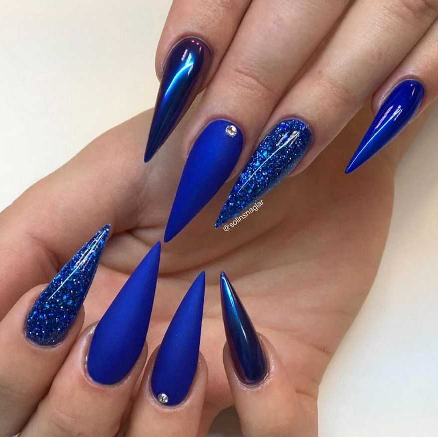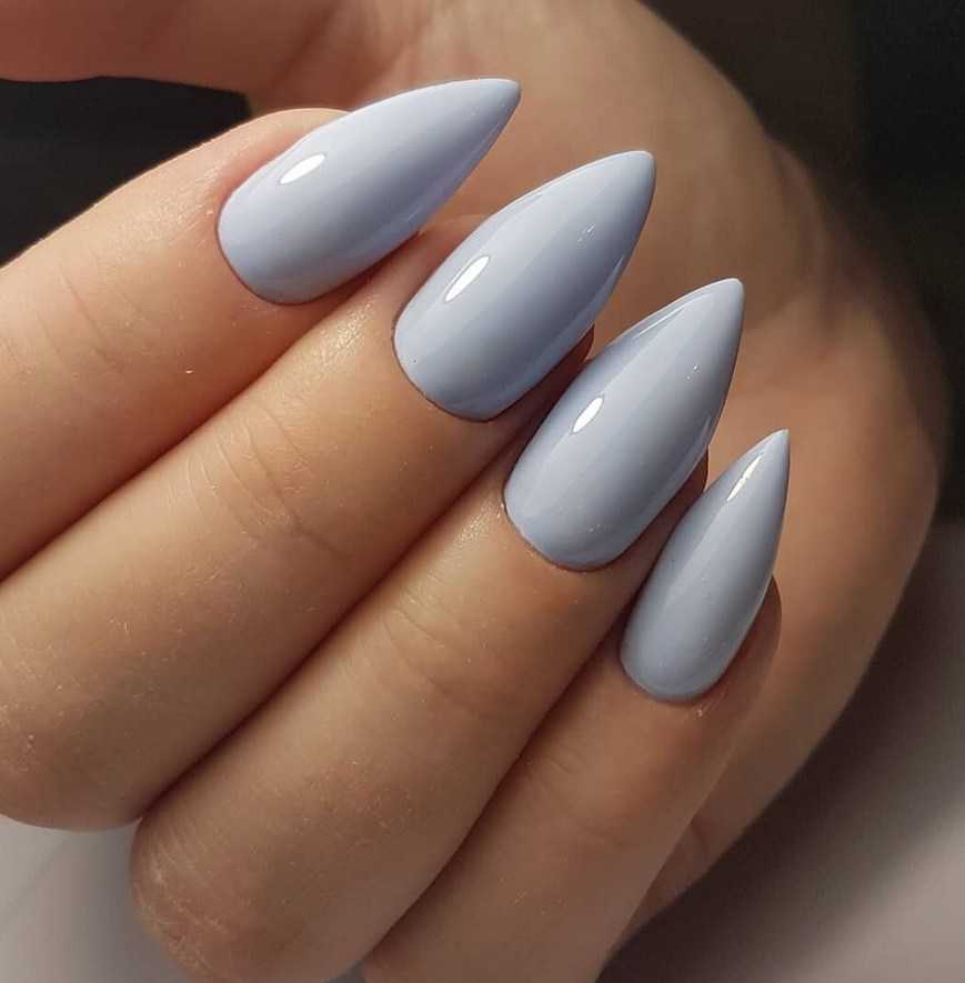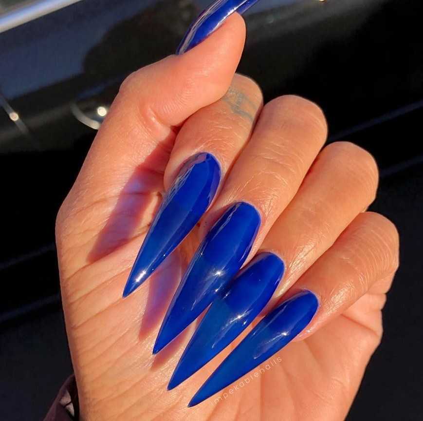 Синий. Этот оттенок является глубоким и насыщенным. На заострённой форме он смотрится благородно в матовом и глянцевом варианте, особенно, с украшением из блёсток, стразов, рисунков контрастным лаком. Для дуэта можно выбирать голубой, бирюзовый, мятный цвет. Хорошие марки покрытий — Maybelline New York Colorama, тон 80, Essie, тон 92 «Голубые Карибы».