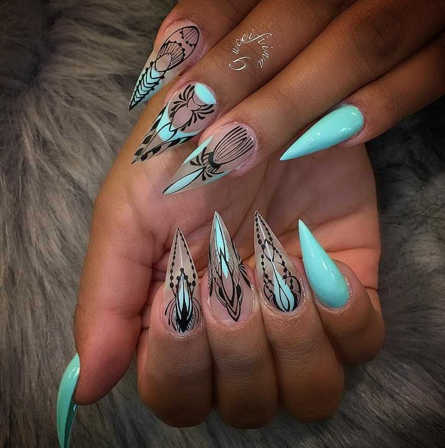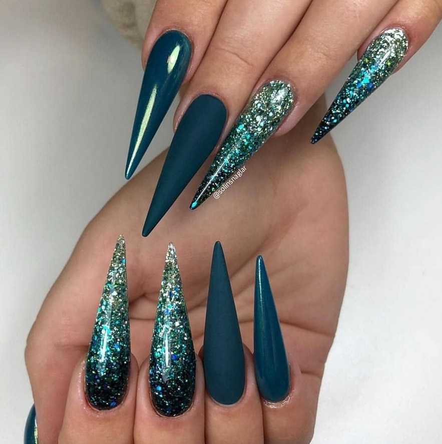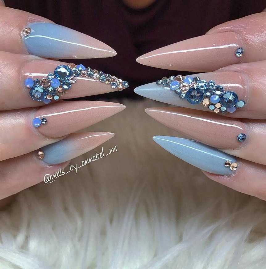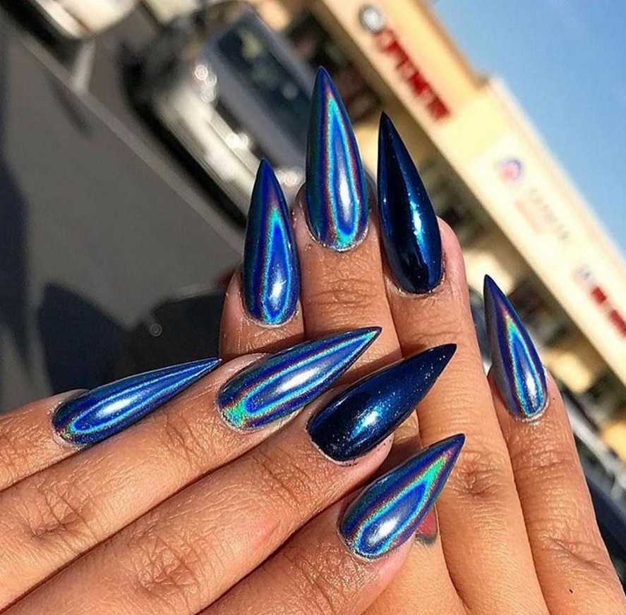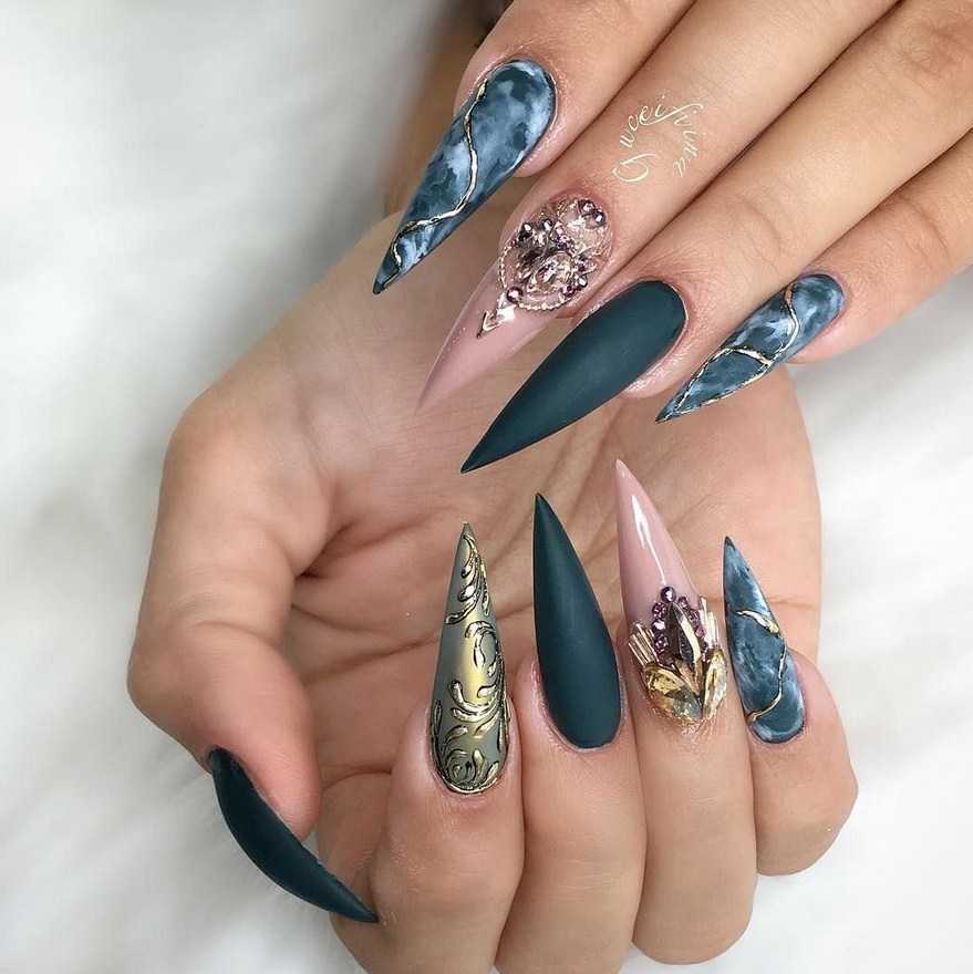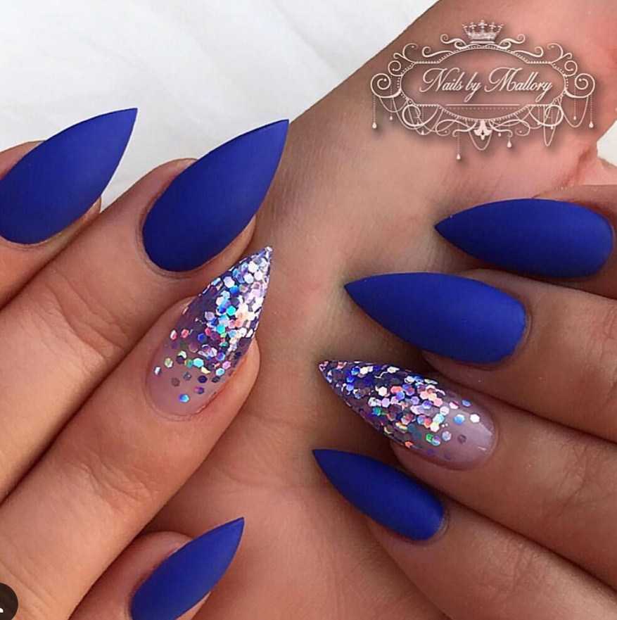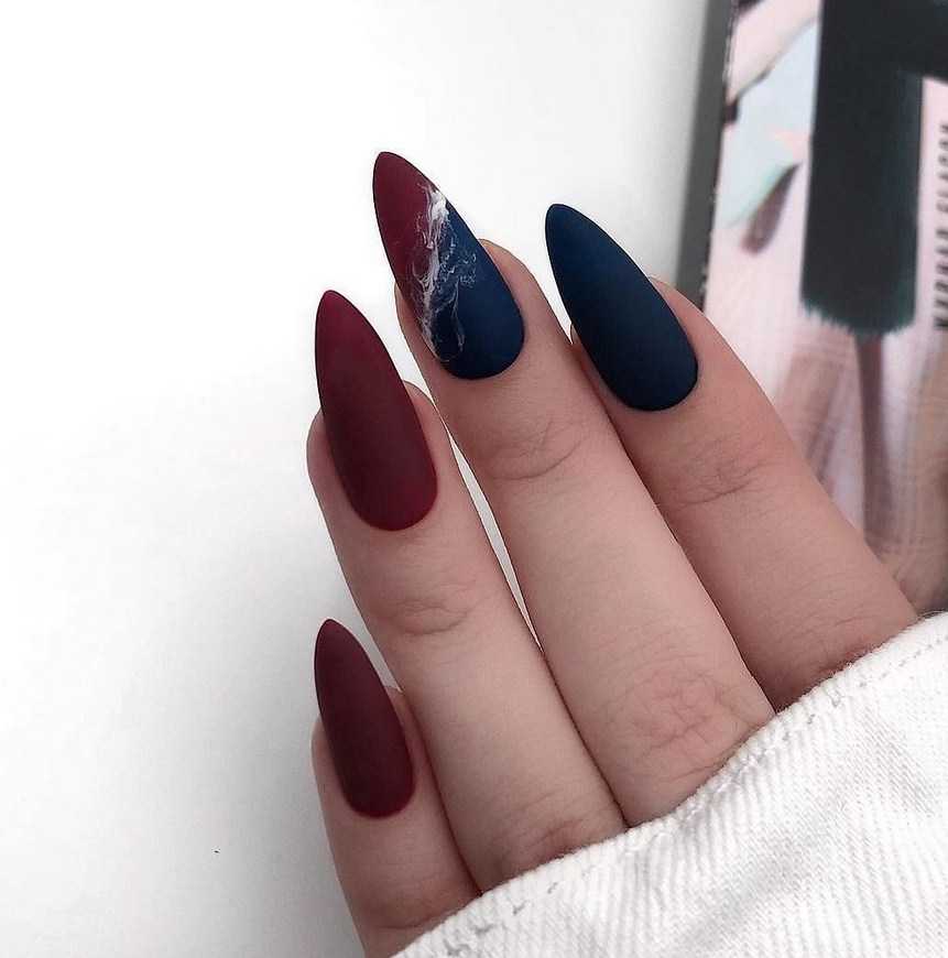 Синий. Этот оттенок является глубоким и насыщенным. На заострённой форме он смотрится благородно в матовом и глянцевом варианте, особенно, с украшением из блёсток, стразов, рисунков контрастным лаком. Для дуэта можно выбирать голубой, бирюзовый, мятный цвет. Хорошие марки покрытий — Maybelline New York Colorama, тон 80, Essie, тон 92 «Голубые Карибы».
