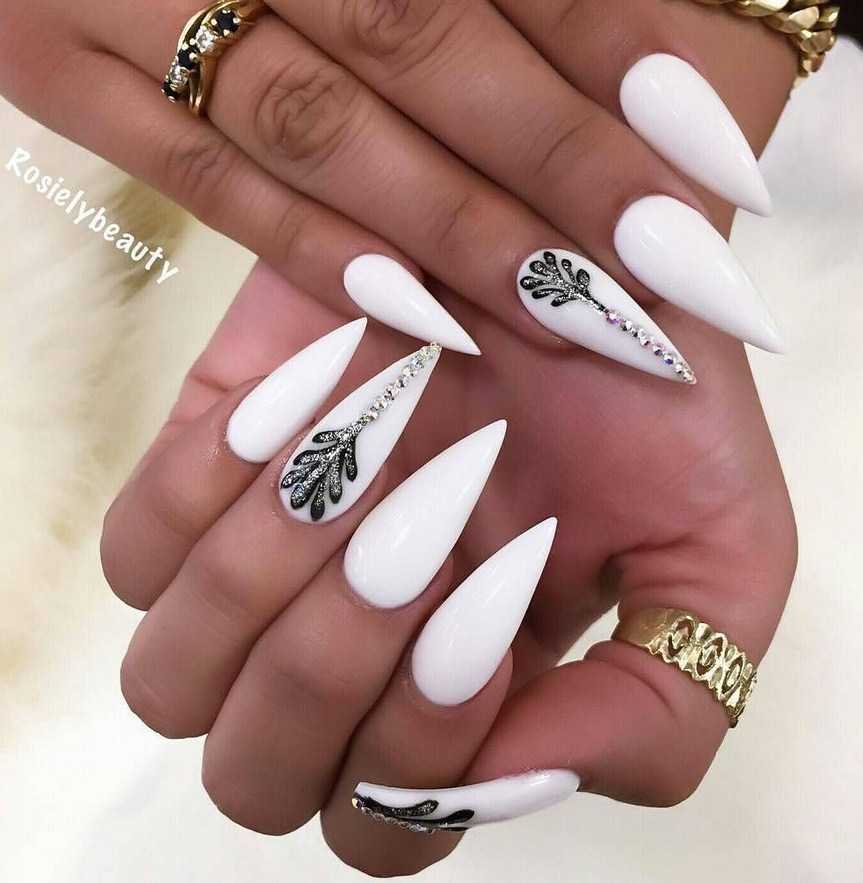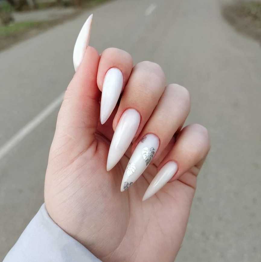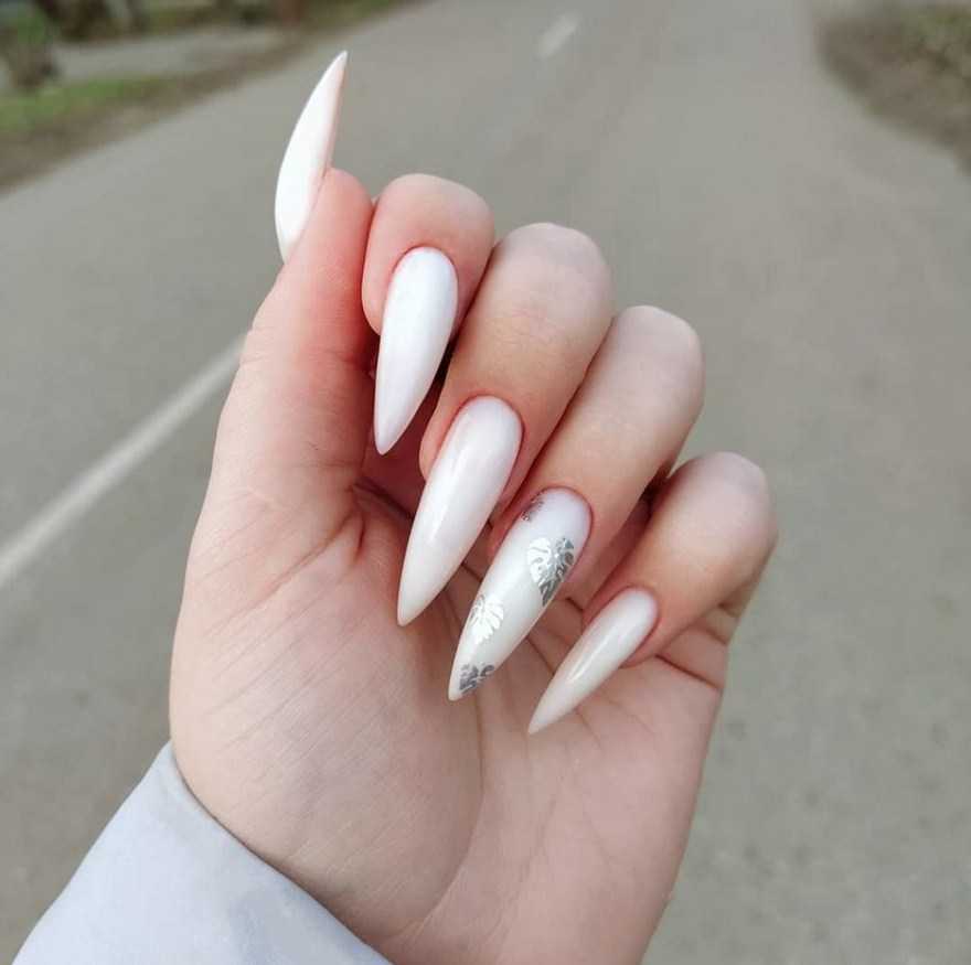 Белый. Классический цвет никогда не выходит из моды. На заострённой форме с белой базой идеально смотрятся любые рисунки, узоры, роспись, наклейки и стемпинг, стразы и глиттер. Для красивого маникюра стоит выбрать хорошие покрытия – лаки Kodi Basic Collection, 01 BW, Nail Passion, тон 1002 «Снежная королева».