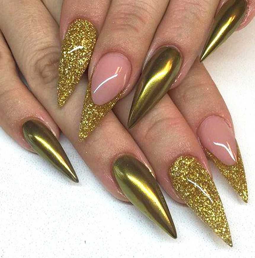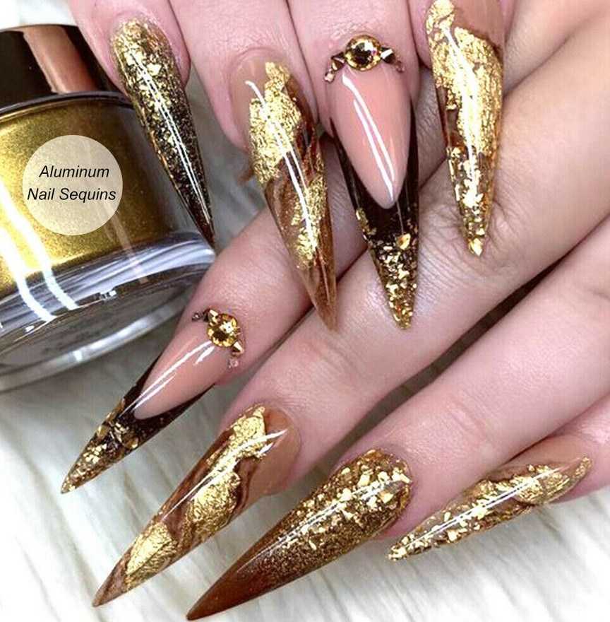 Золотистое дополнение к естественному образу помогут добавить: фольга; блестки; маникюрная пыль; клейкая лента различных размеров; акрил или лак; наклейки и слайдеры.