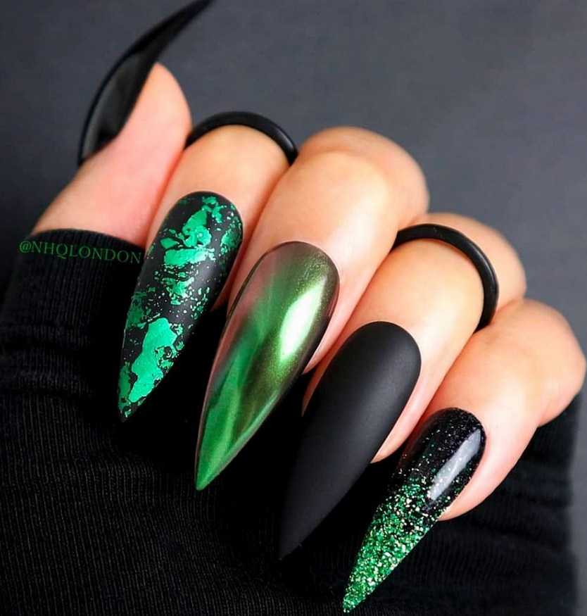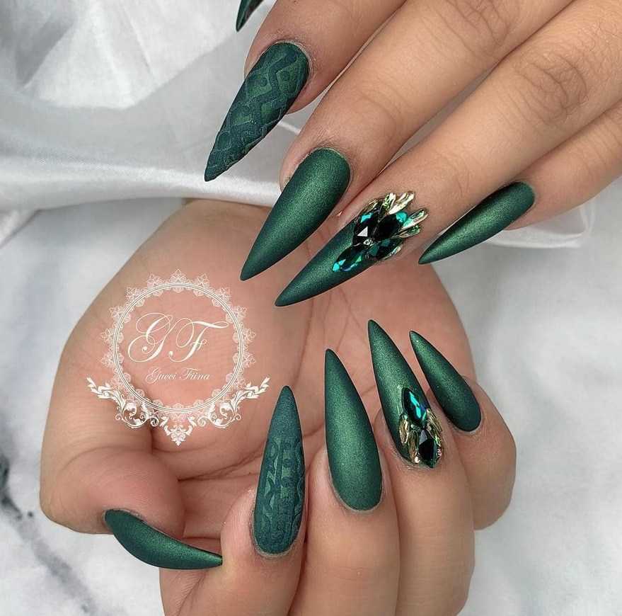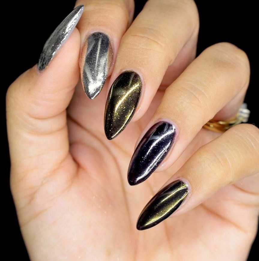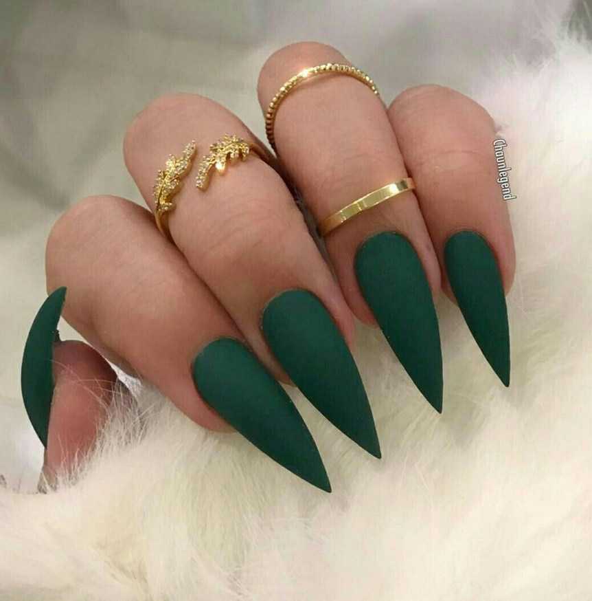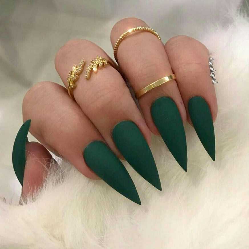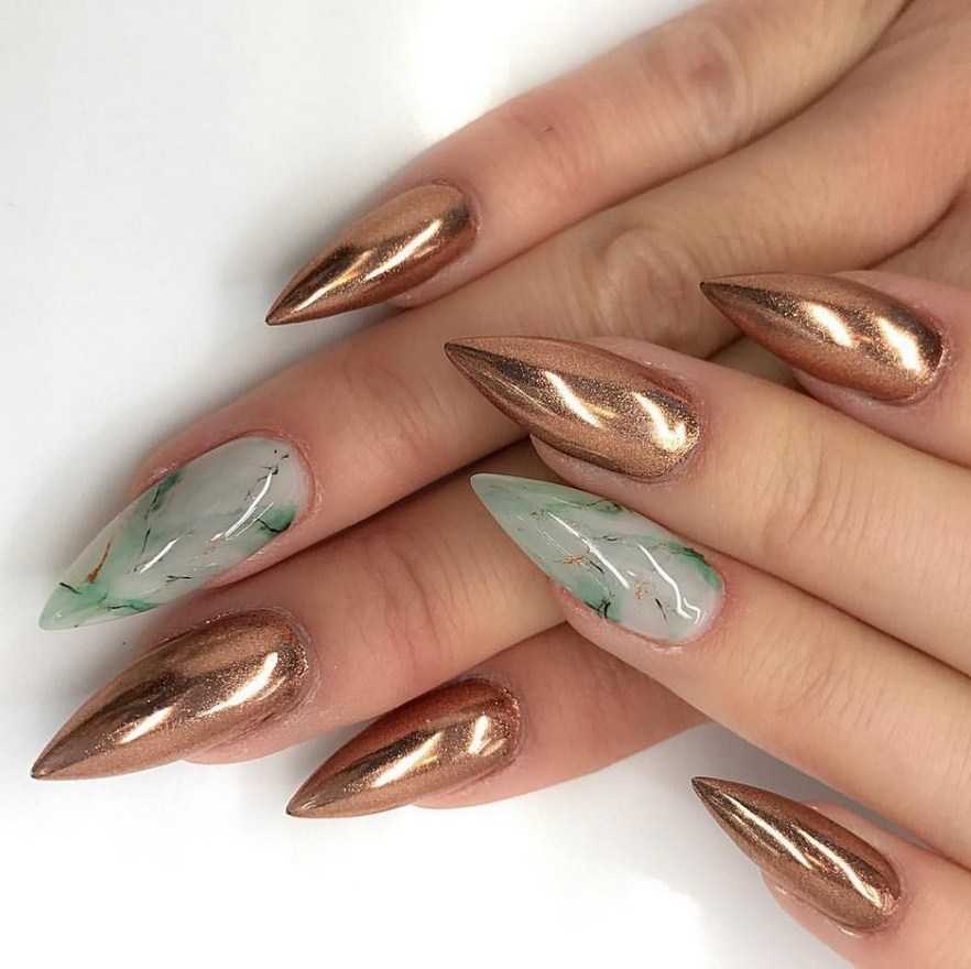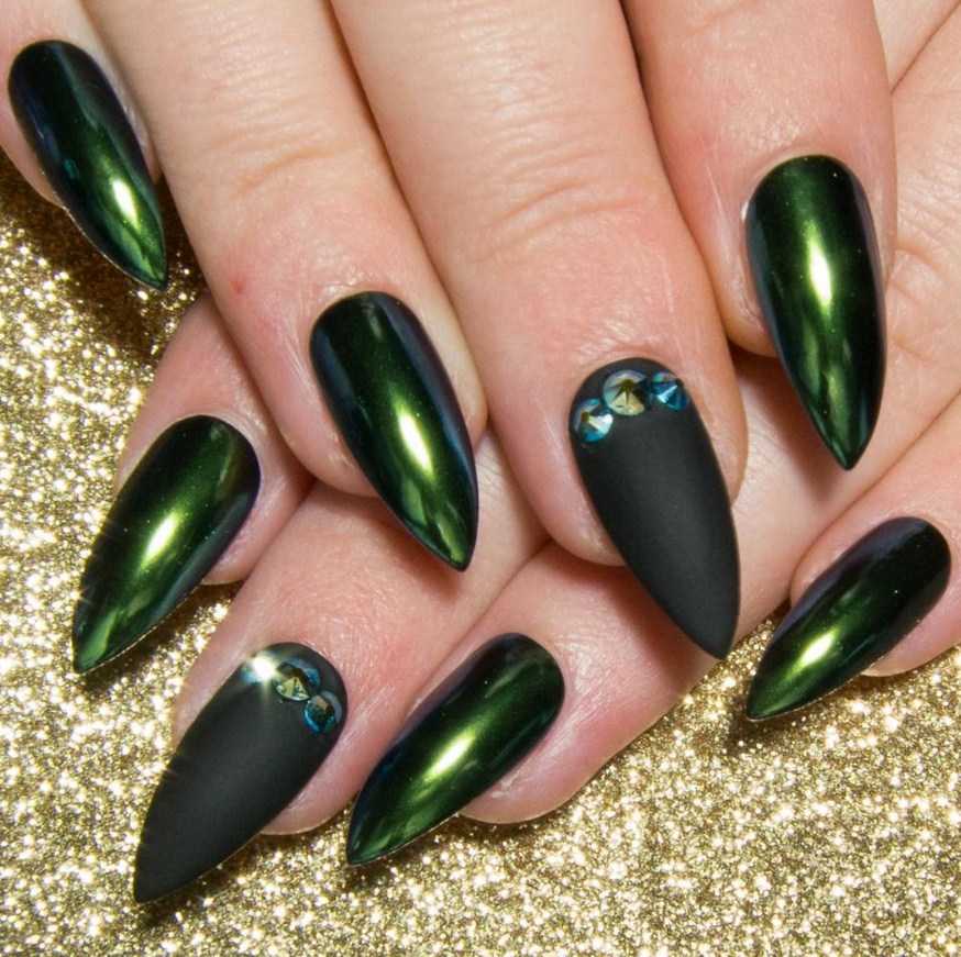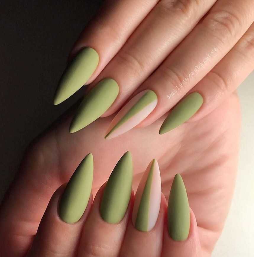Зелёный. Любые оттенки зелёного эффектны на острых ноготках. В 2023 году такой маникюр будет на пике популярности, особенно, в серо-зелёных и зелёно-коричневых тонах. Природные оттенки идеальны для вечернего маникюра в комбинации с блестящим декором. Есть и другие способы, как наносить шеллак зелёного оттенка на заострённые ноготки – украсить их втиркой или эффектом кошачьего глаза. Классные лаки — Vogue Nails, тон «Изумрудный перелив», Vogue Nails, тон «Зелёный чай».