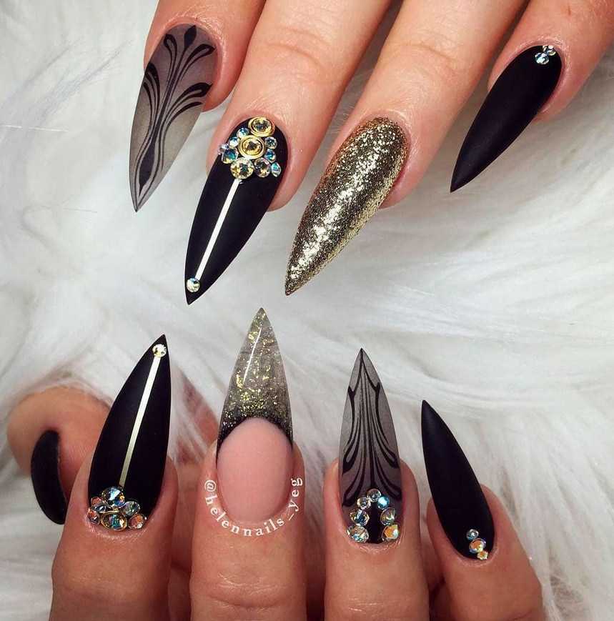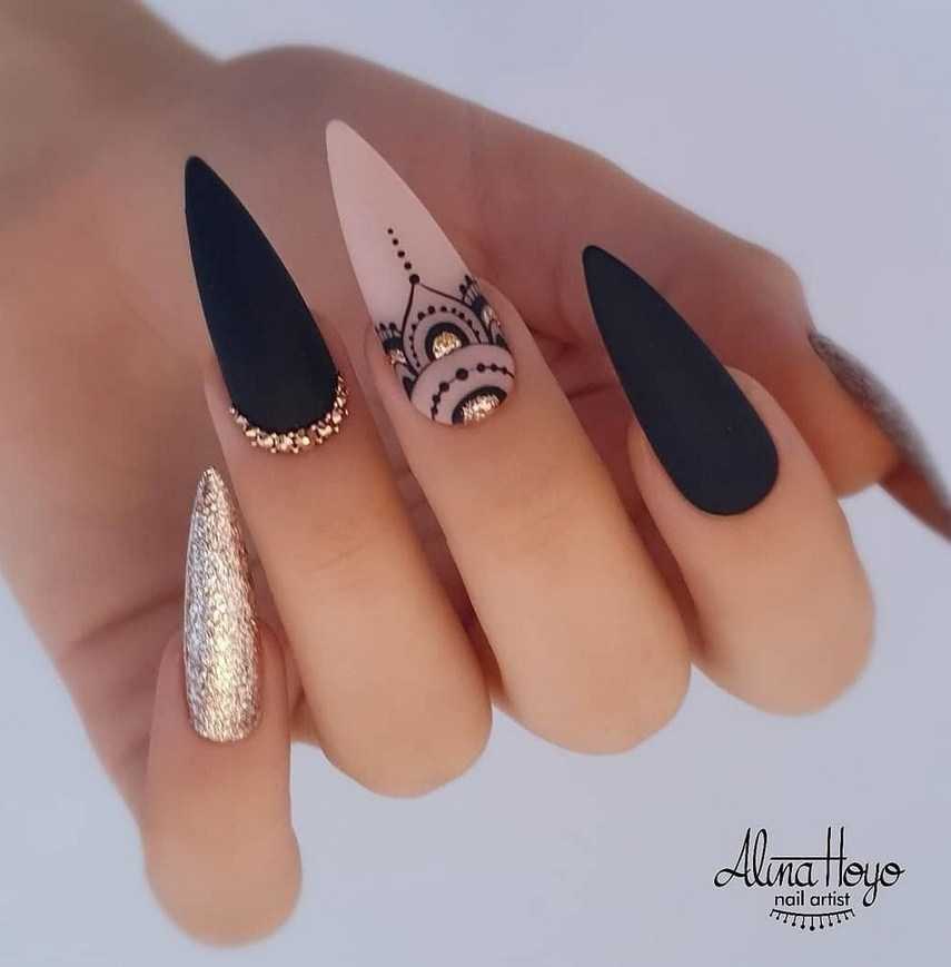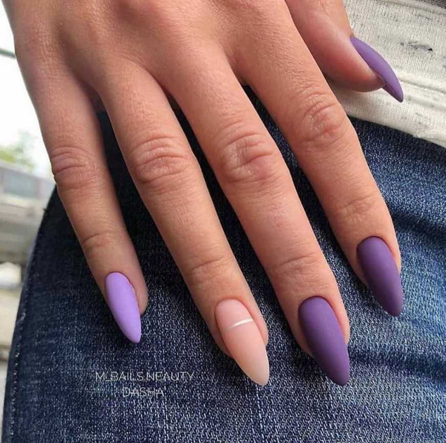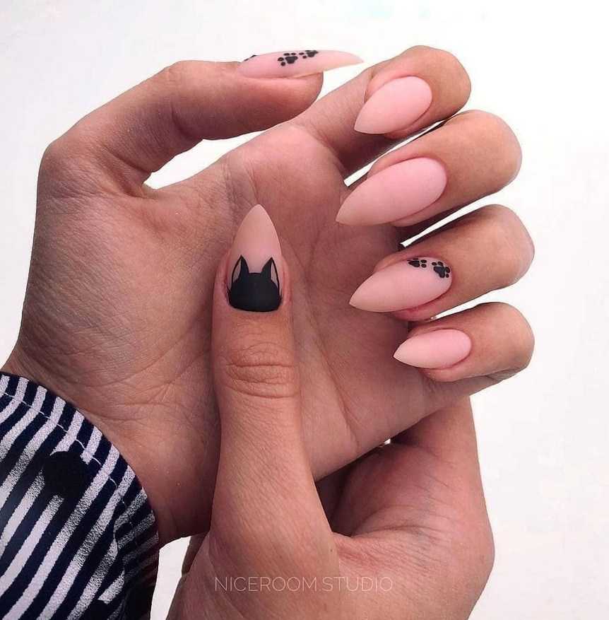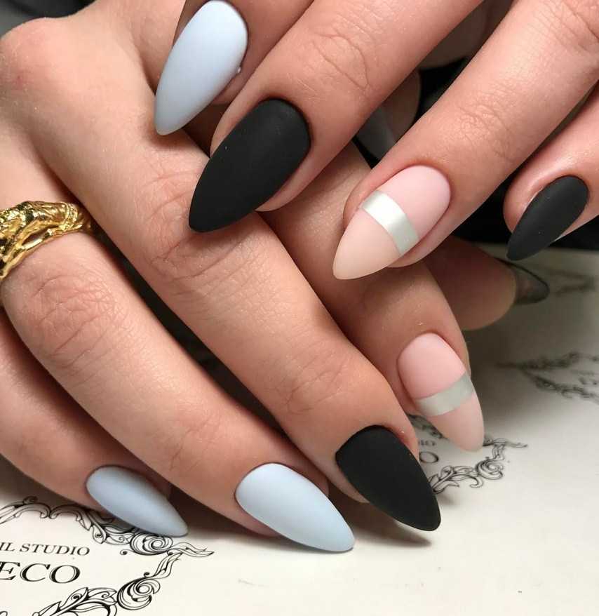 Особенностью нейл-моды нового сезона является применение матовых покрытий. Для заострённых ногтей матовый гель-лак подойдёт шикарно: он немного сгладит их дерзость, обеспечит чувство стиля и визуально удлинит пальцы. Матовый дизайн можно комбинировать с рисуночками, стразами, глиттером.