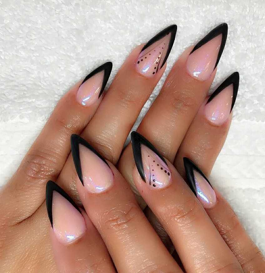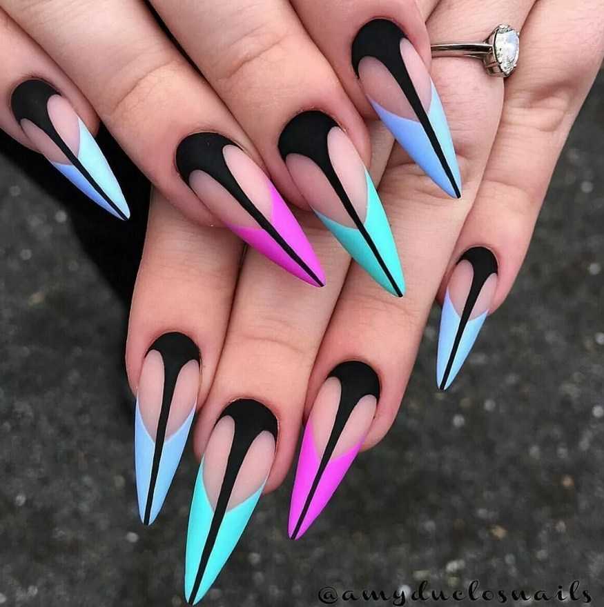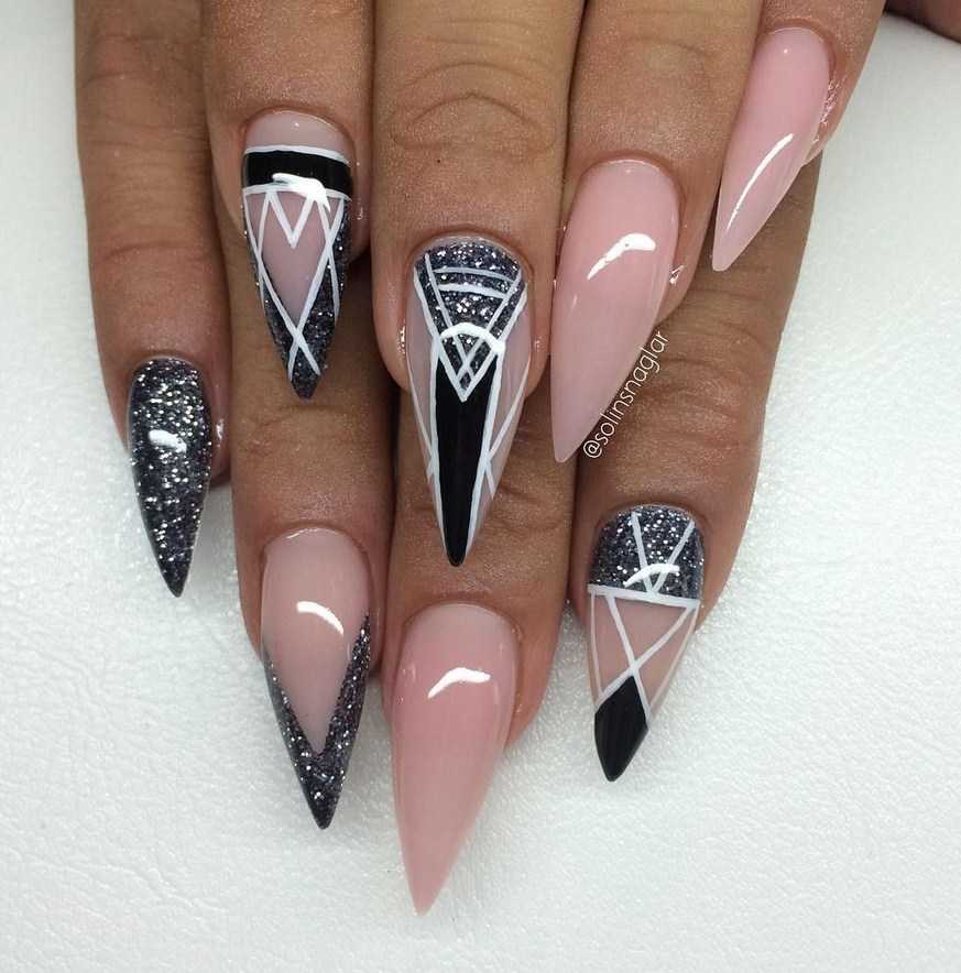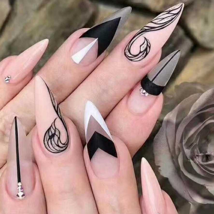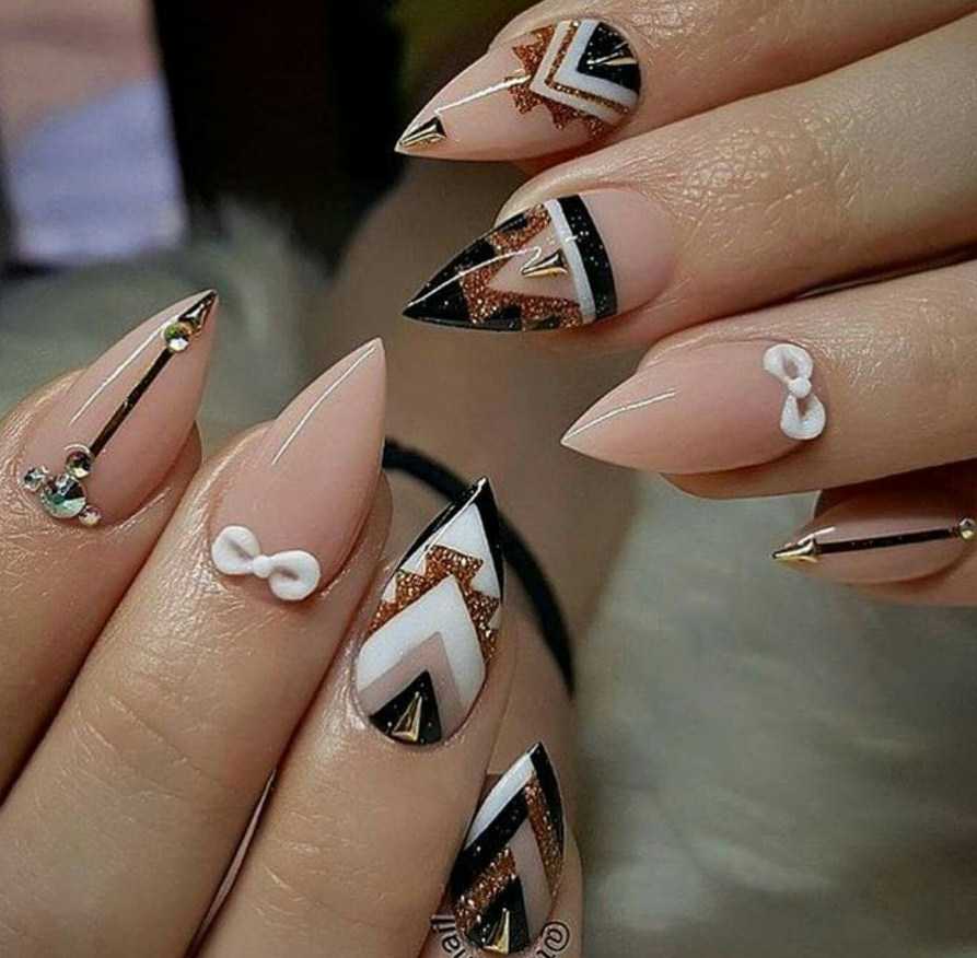 Также можно декорировать ногтевые пластины рисунками геометрических фигур – ромбами, треугольниками, которые красиво перекликаются с острым кончиком.