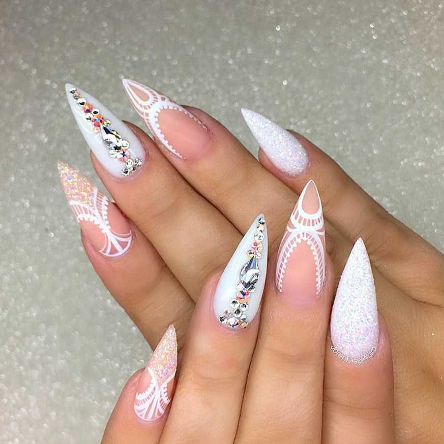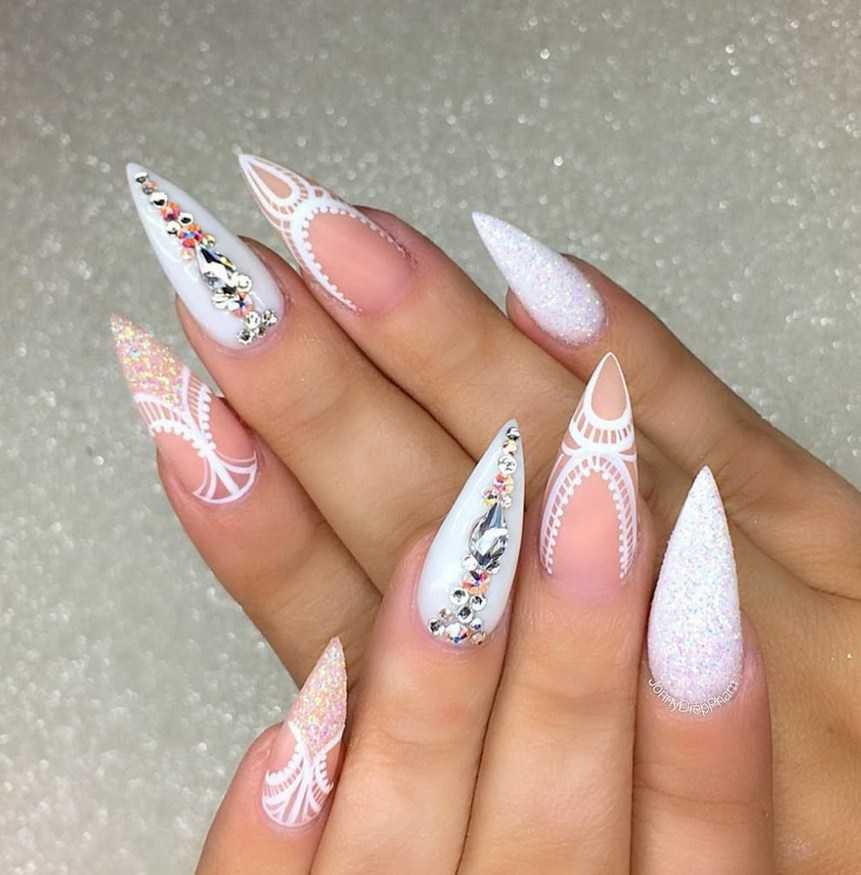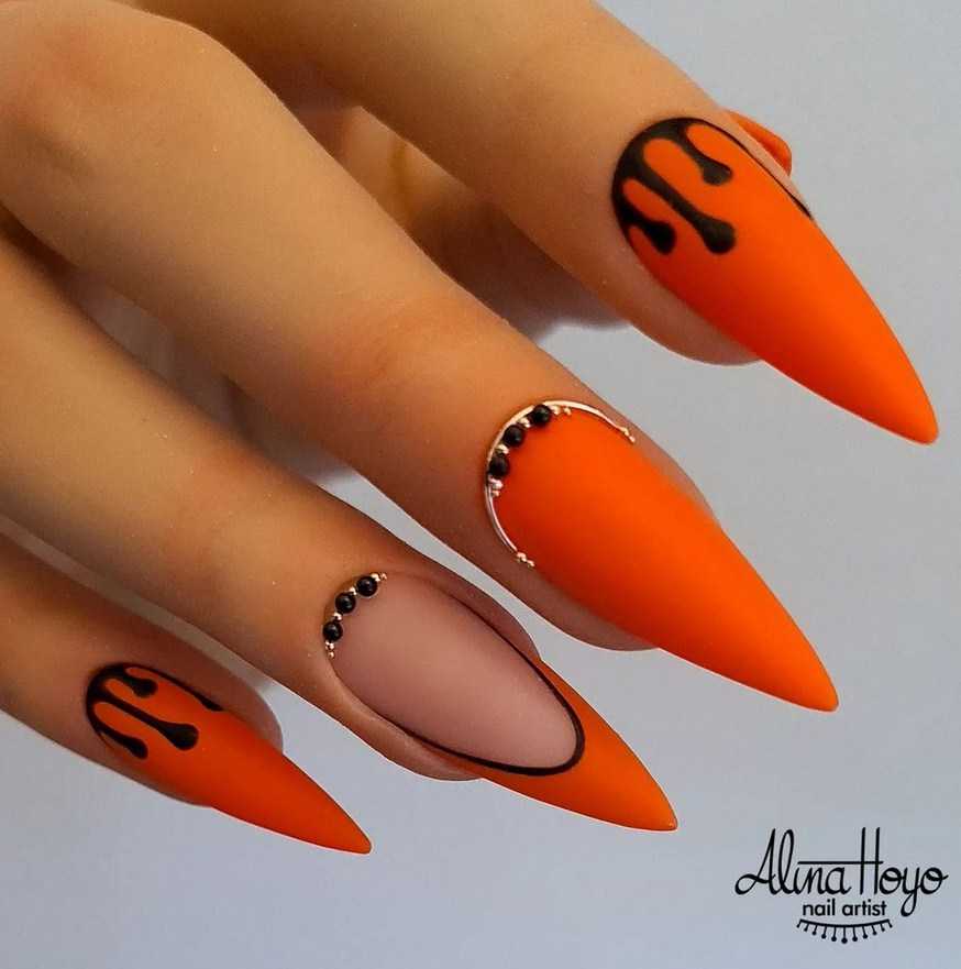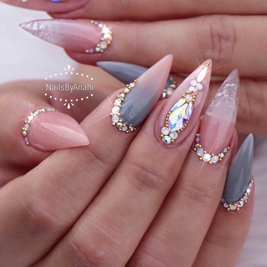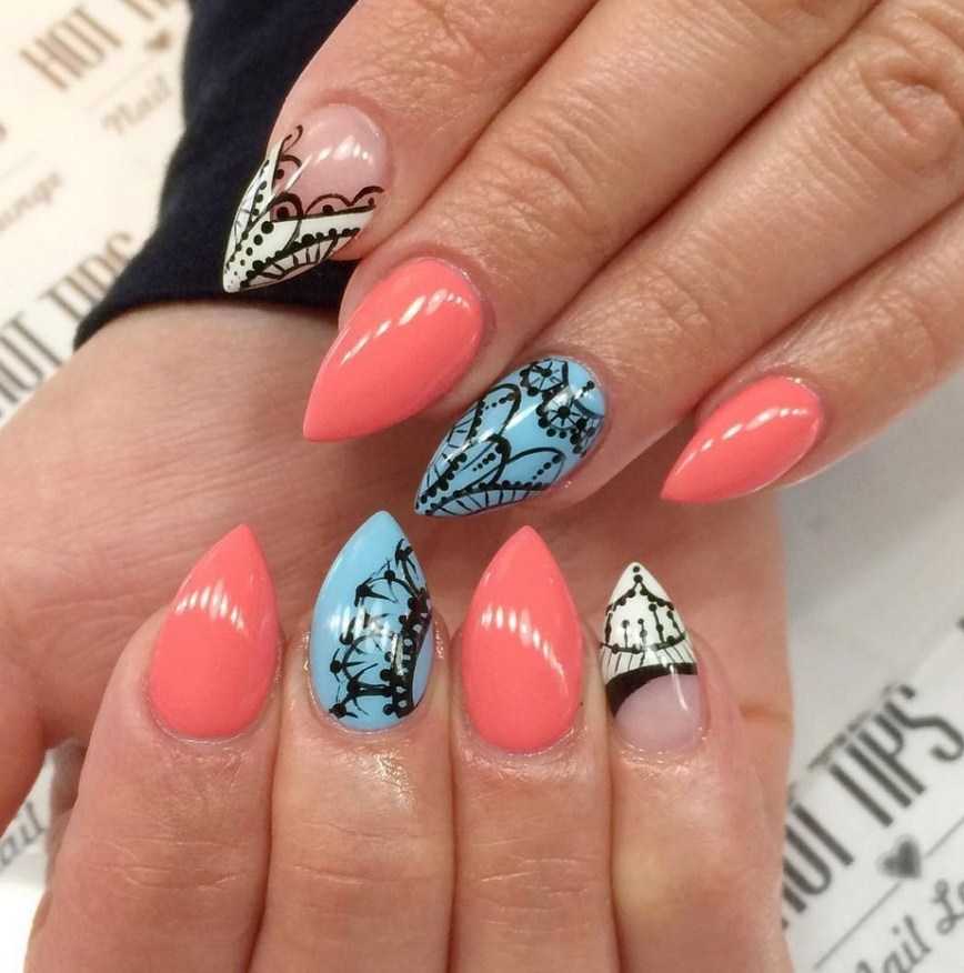 Также можно декорировать ногтевые пластины рисунками геометрических фигур – ромбами, треугольниками, которые красиво перекликаются с острым кончиком.