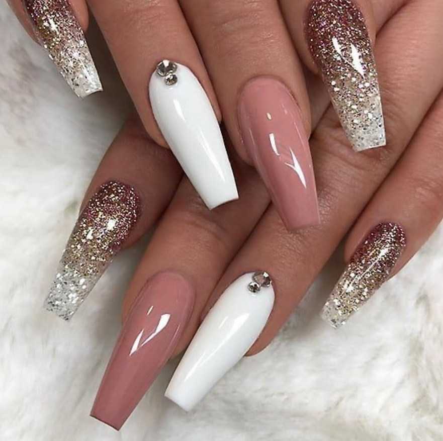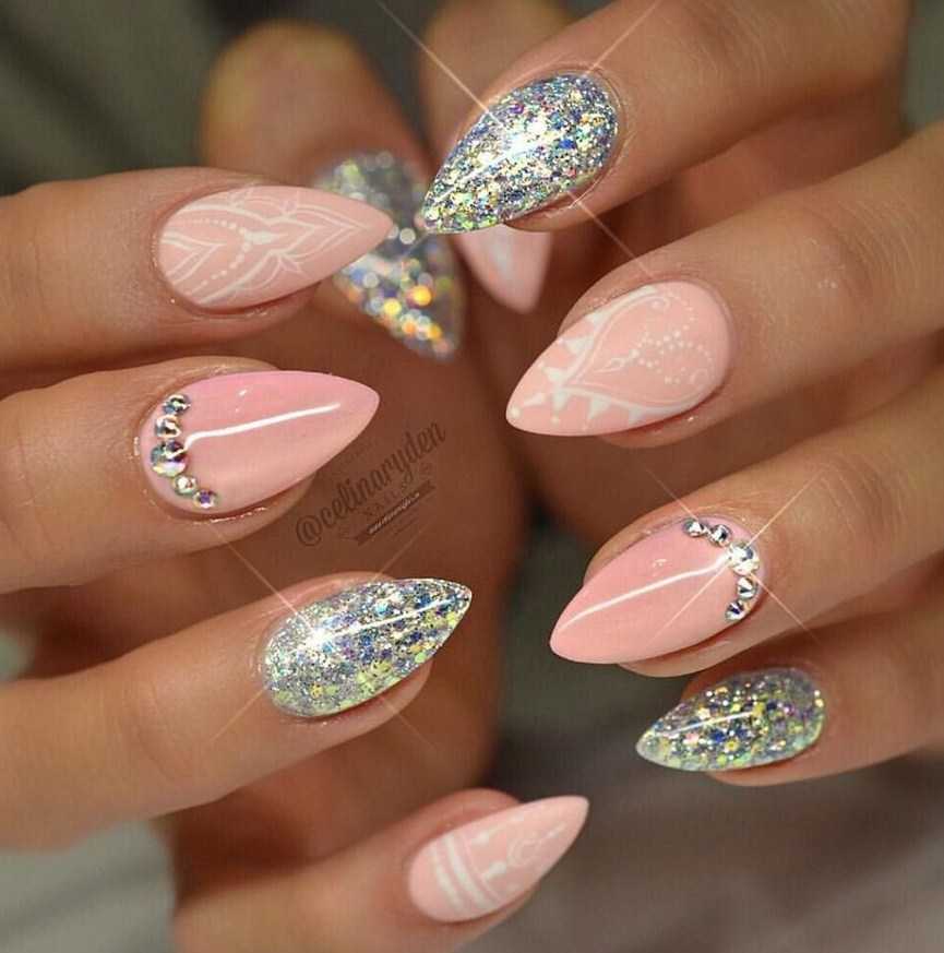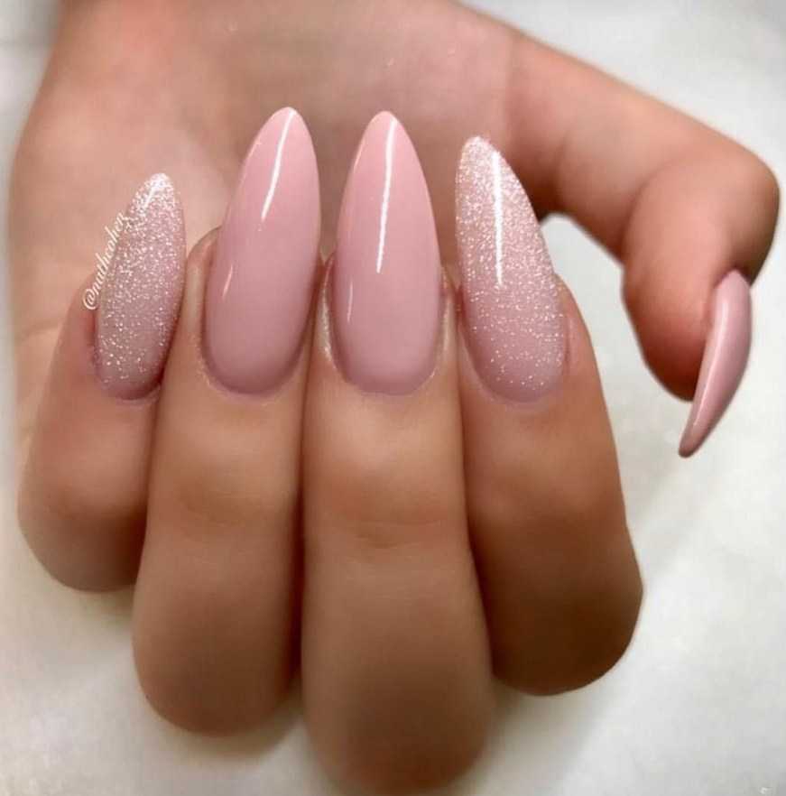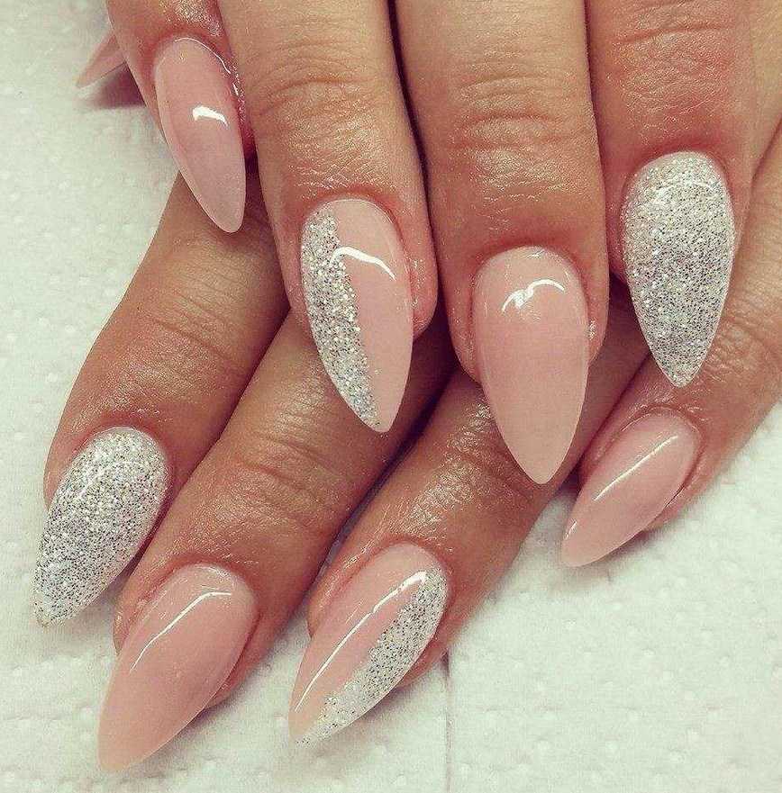 На фото модные тенденции 2019 нюдового дизайна ногтей с блестками: