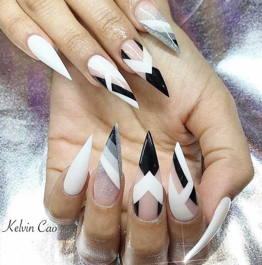 Заострённая форма маникюра шикарно перекликается с линиями любого направления – диагональными, вертикальными, горизонтальными.
