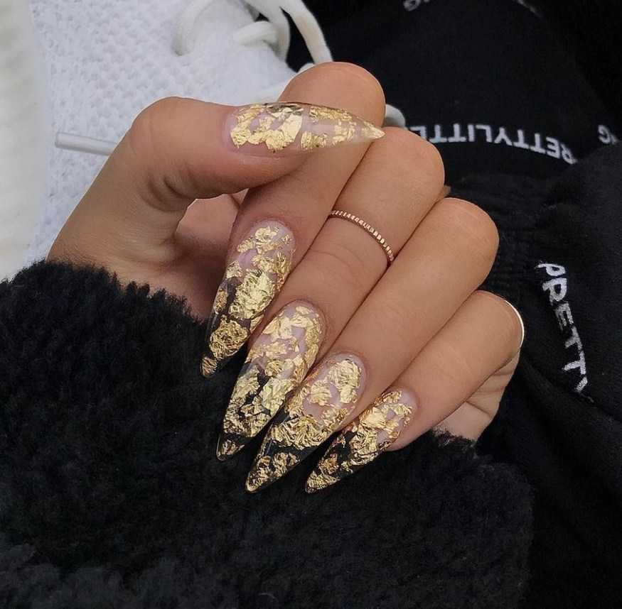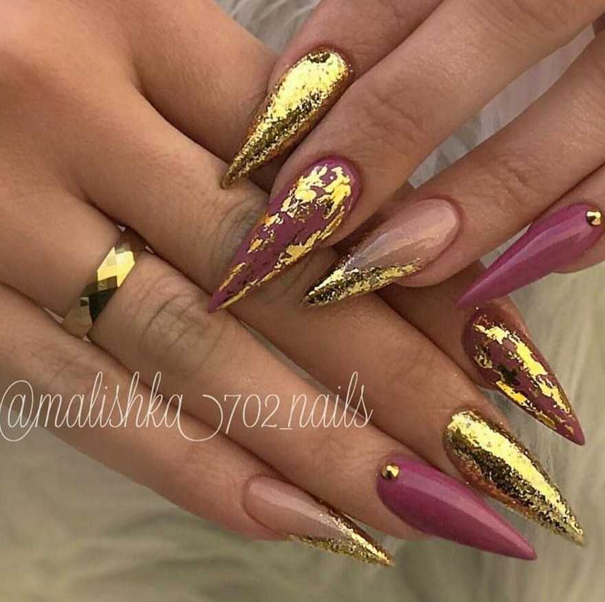 Разложить кусочки фольги одинаково по всем ноготкам вряд ли получится, но в оригинальности и разнообразии и состоит прелесть такого маникюра. На ногтях заострённой формы стоит выполнить отдельные акценты фольгой серебристого или золотистого оттенка.