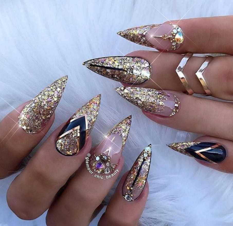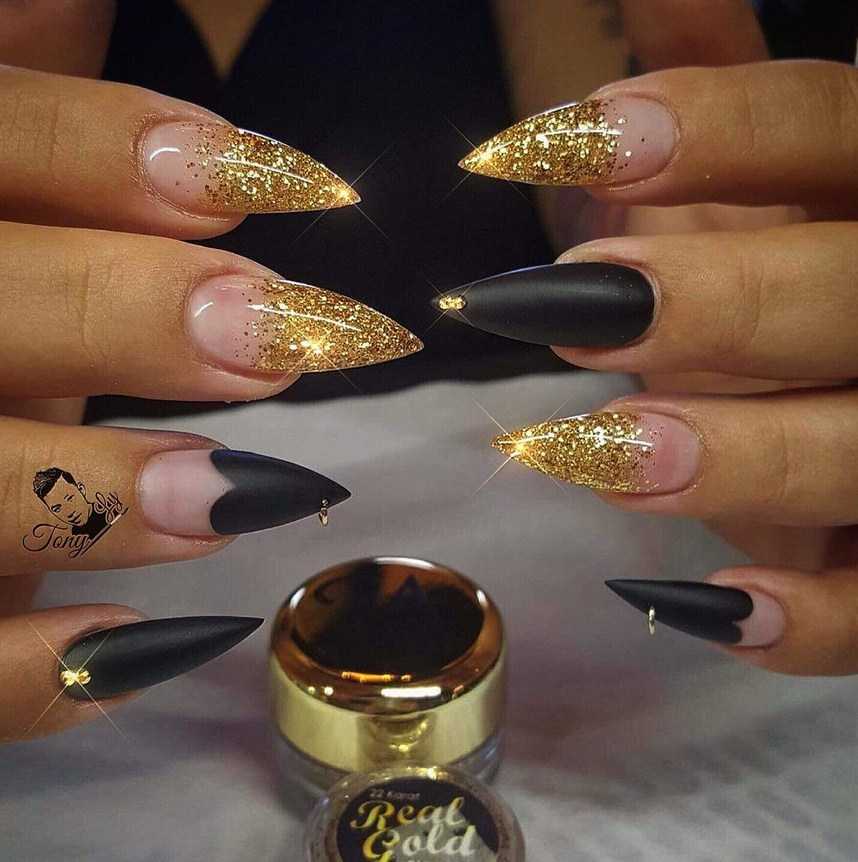 Серебро и золото. Шикарная идея – украсить кончики острых ноготков золотистым лаком (OPI Love, тон «Золото»)