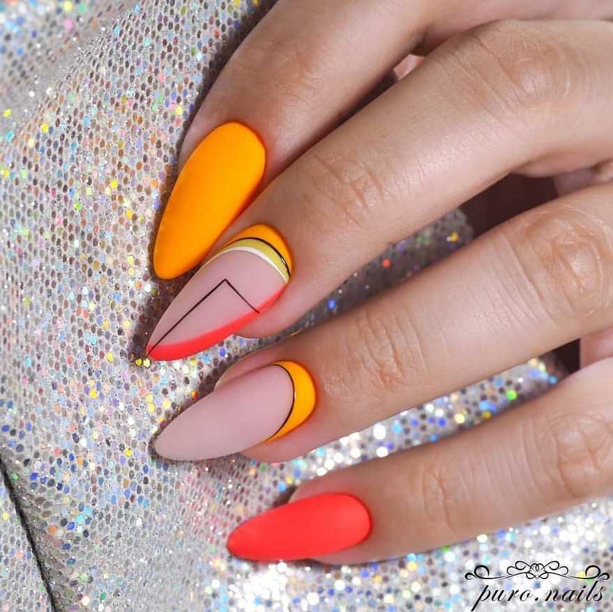 Часто мастера прибегают к приему, где в нюдовом маникюре появляется один яркий, контрастный цвет, который становится украшением всего дизайна, в том числе и геометрии. Это могут быть как элементы в одном цвете, но более контрастные по тону, так и отдельно выбранный цвет.