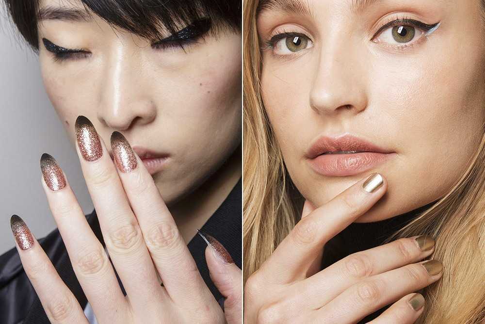 Смелый и красивый вариант маникюра – покрытие сияющим лаком, содержащим светоотражающие частицы, блёстки, металлизированные элементы. Если же основной оттенок лака будет спокойным, то блестящие частички только подчеркнут его элегантность и изящество.