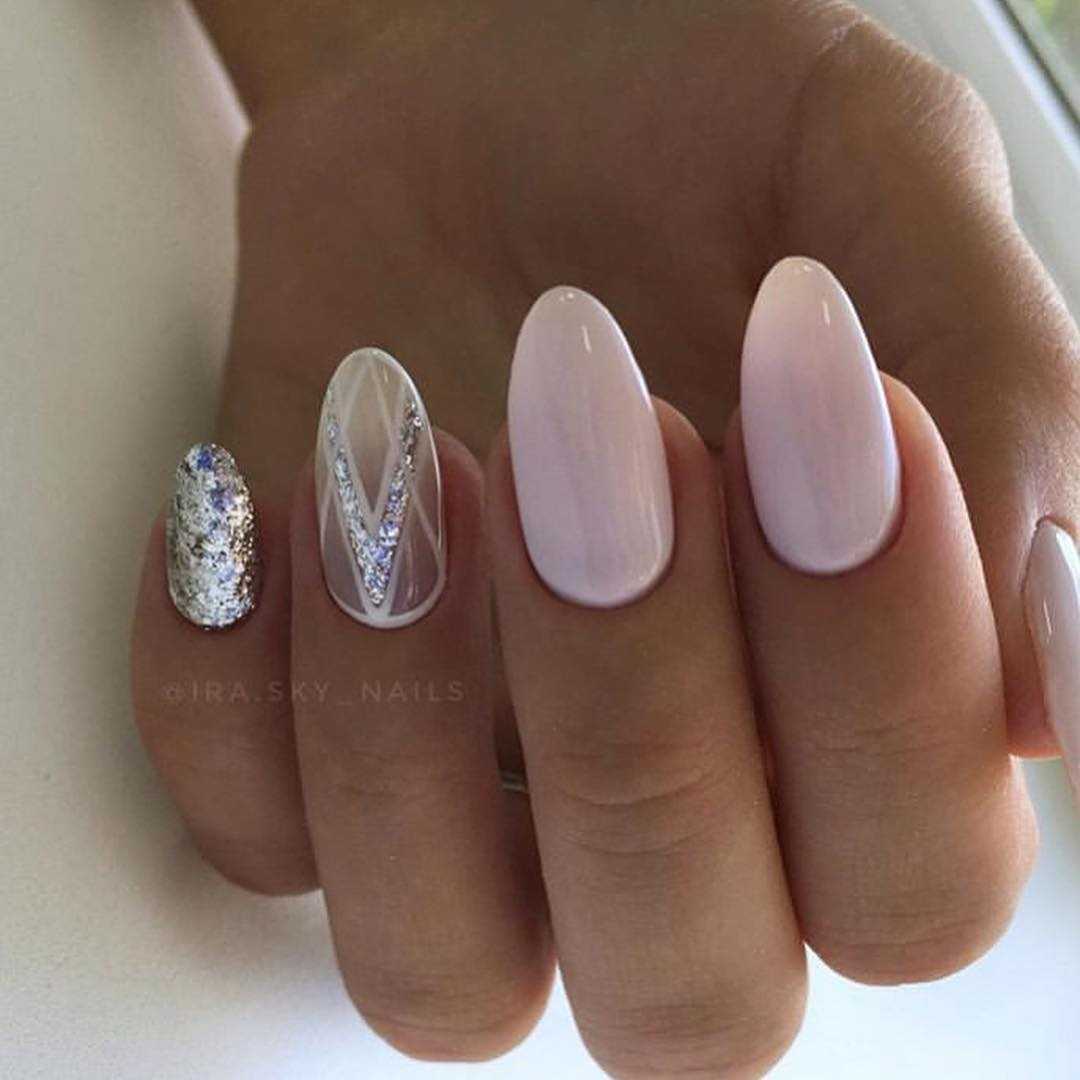 Когда поиск основывается на понятиях нежности и женственности в качестве маникюра предлагается остановить свой выбор на ногтевую форму миндаль, где есть нюдовые оттенки, а также блески в качестве дополнений.