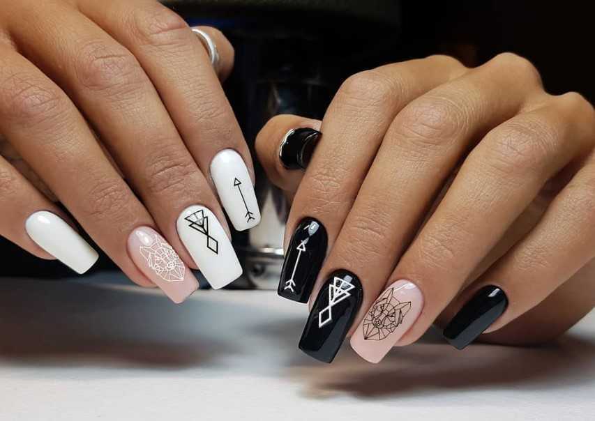 Геометрические узоры в ахроматических цветах востребованы у обладательниц коротких ногтей квадратной формы. Четкие линии в дизайне отлично дополняют острые углы.